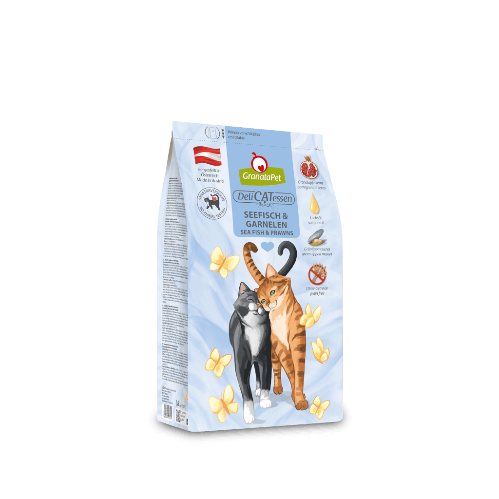 GranataPet DeliCATessen Trockenfutter Seefisch & Garnelen versorgt Deine Katze dank der erlesenen, natürlichen Zutaten mit allen Nährstoffen, die sie braucht. Die Komposition beinhaltet einen sehr hohen Fleischanteil aus Muskelfleisch sowie hochwertige Innereien. Abgerundet wird die Rezeptur durch die Neuseeländische Grünlippmuschel zum Schutz von Knochen und Gelenken, Granatapfelkerne zum Schutz des Immunsystems sowie Lachsöl als wertvoller Lieferant von Omega-3- und Omega-6- Fettsäuren. Die enthaltenen Katzenminzeblätter fördern die Akzeptanz und tragen zum Wohlbefinden der Katze bei.
