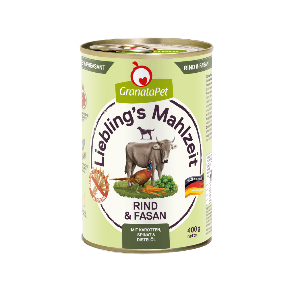GranataPet Liebling's Mahlzeit is the ideal, balanced complete food thanks to its meaty, fine composition - gently steam-cooked just once. The targeted addition of carrots, spinach and safflower oil deliberately refines this dog food and manages to win over every dog's heart with only healthy and tasty ingredients.