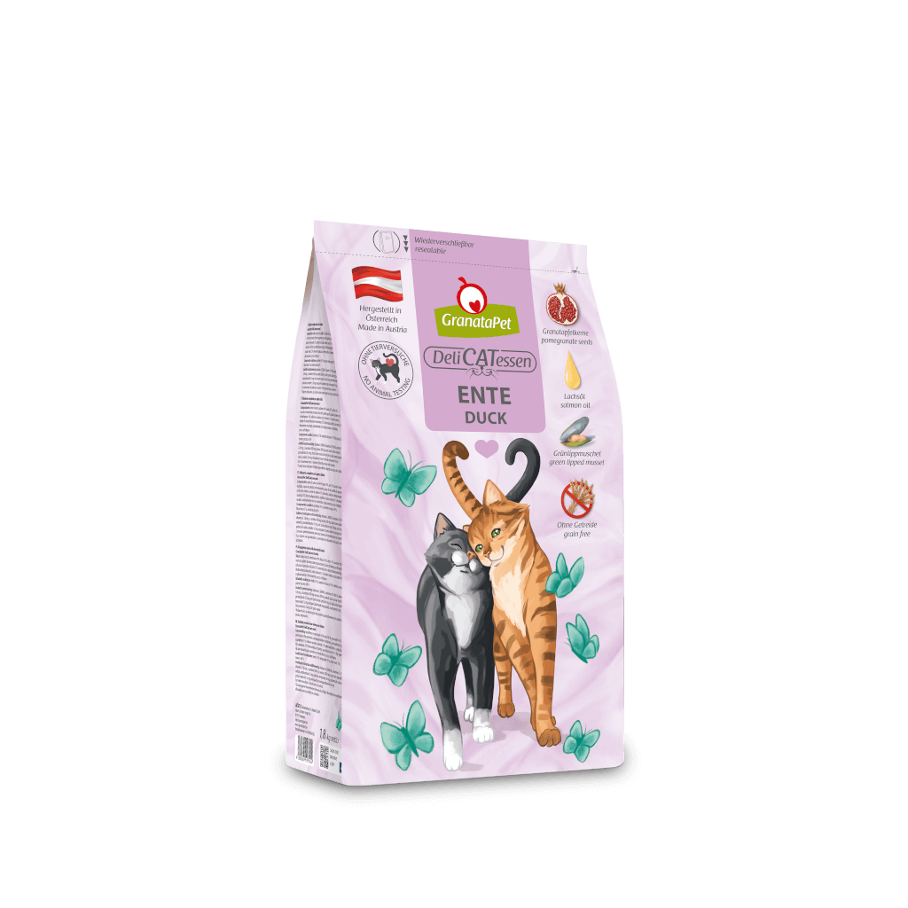GrantaPet DeliCATessen dry food is a high-quality complete feed for cats at every stage of life - grain-free, with a high meat content, pomegranate seeds, salmon oil, catnip and taurine. As cats are carnivores and carnivores by nature, their digestive system is designed accordingly. Cereals are difficult for cats to digest and can hardly be utilised. GranataPet therefore does not use cereals in its pet food, thus ensuring an optimal and nature-orientated diet. GranataPet DeliCATessen dry food is developed without animal testing and is produced in Austria. The gentle manufacturing process ensures that important nutrients and vitamins are retained in the ingredients. Thanks to the deliciously fragrant pomegranate seeds and stimulating catnip, the DeliCATessen meal is also enjoyed by discerning foodies.