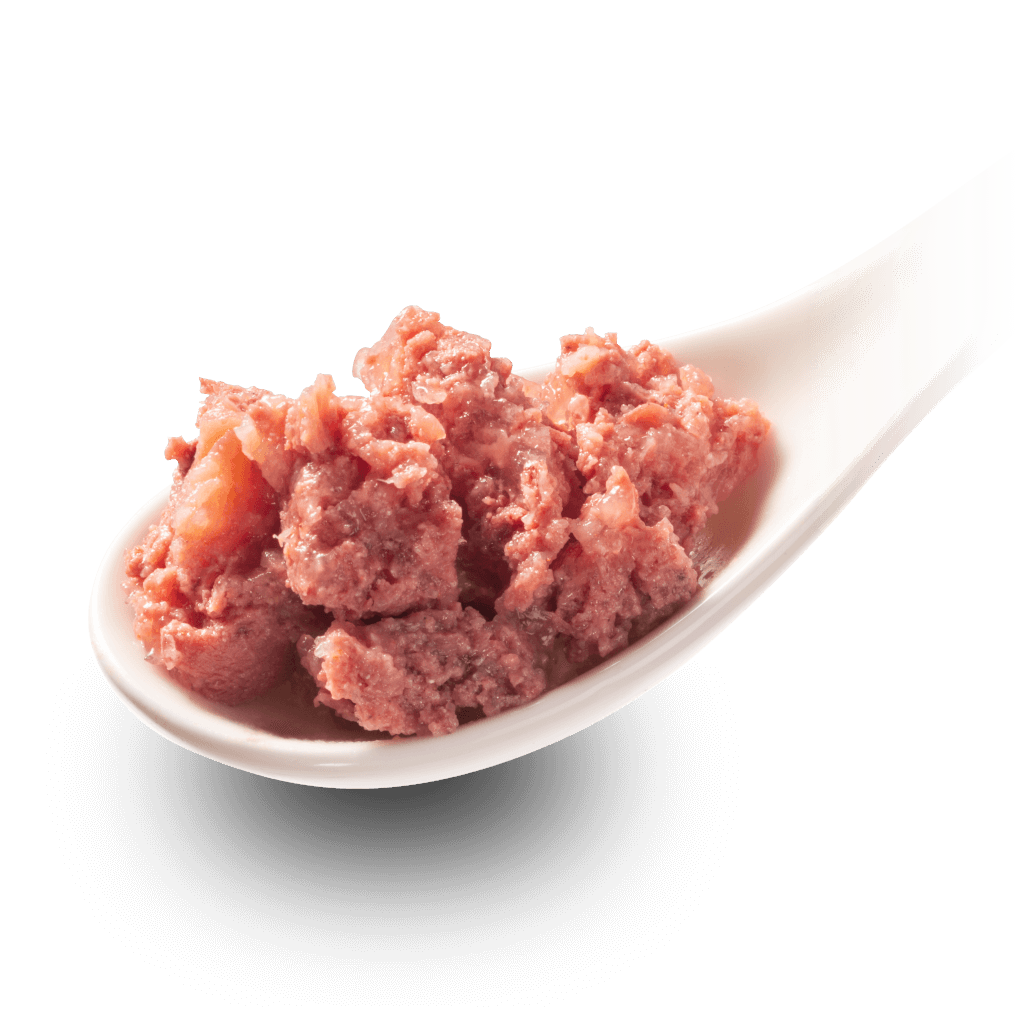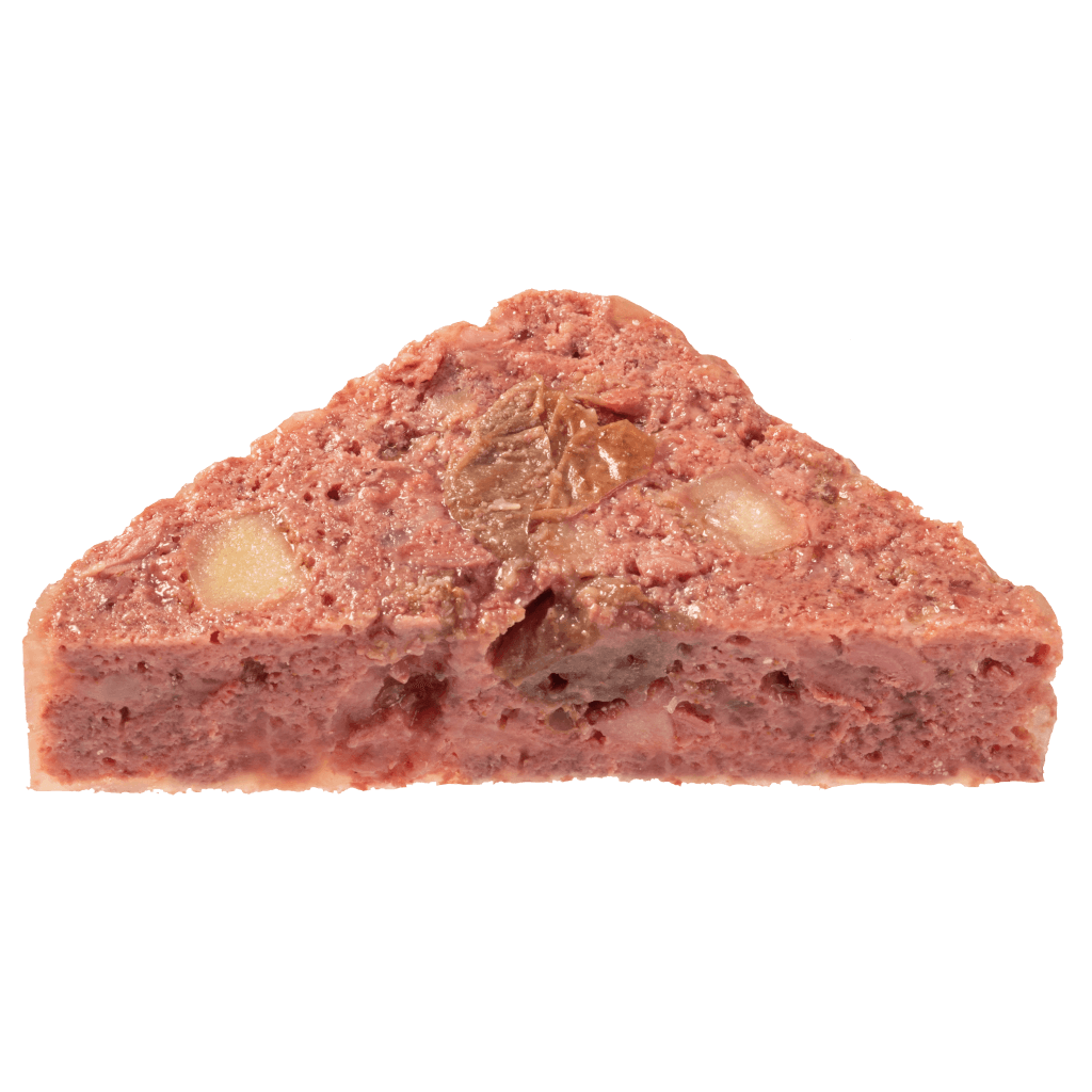 chicken meat, duck meat and goose meat 65% (chicken 35% consisting of muscle meat, heart, liver, gizzard and duck 15% consisting of muscle meat, heart and goose 15% consisting of muscle meat, heart), chicken and duck and goose broth 24,4%, parsnips 5%, cranberry 2%, pomegranate seeds 1% (dried and finely ground), spinach 1%, mineral nutrients 1%, borage oil 0,5%, green-lipped mussel 0,1% (finely ground, naturally rich in glucosamin and chondroitin)