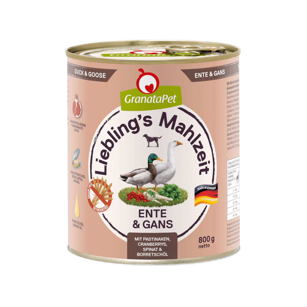 GranataPet Liebling's Mahlzeit is the ideal, balanced complete food thanks to its meaty, fine composition - gently steam-cooked just once. The targeted addition of parsnips, cranberries, spinach and borage oil deliberately refines this dog food and manages to win over every dog's heart with only healthy and tasty ingredients.