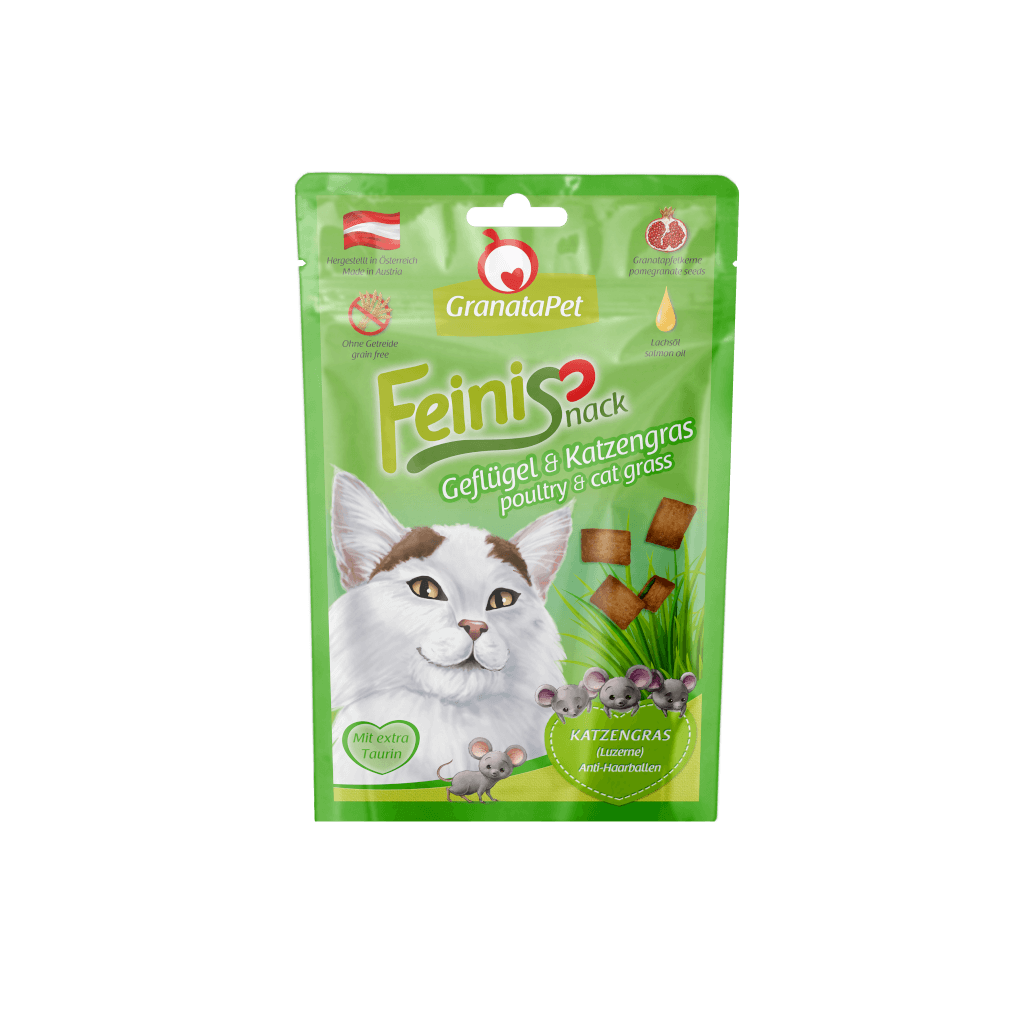 With GranataPet's FeiniSnack Poultry & Cat Grass, you can spoil your cat with a special kind of snack. Your velvet paw can look forward to a crunchy savoury experience with lots of meat and, above all, without any grain. The delicious crunchy pillows are refined with catnip to give the snack that special touch no cat can resist.