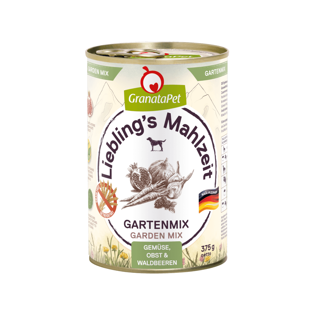 GranataPet Liebling's Mahlzeit Gartenmix PUR is the ideal supplement to meat feeding. Our Gartenmix is used by bartenders or self-caterers to complete a balanced and healthy dog diet. Gently steam-cooked fruit and vegetables provide the necessary balance.