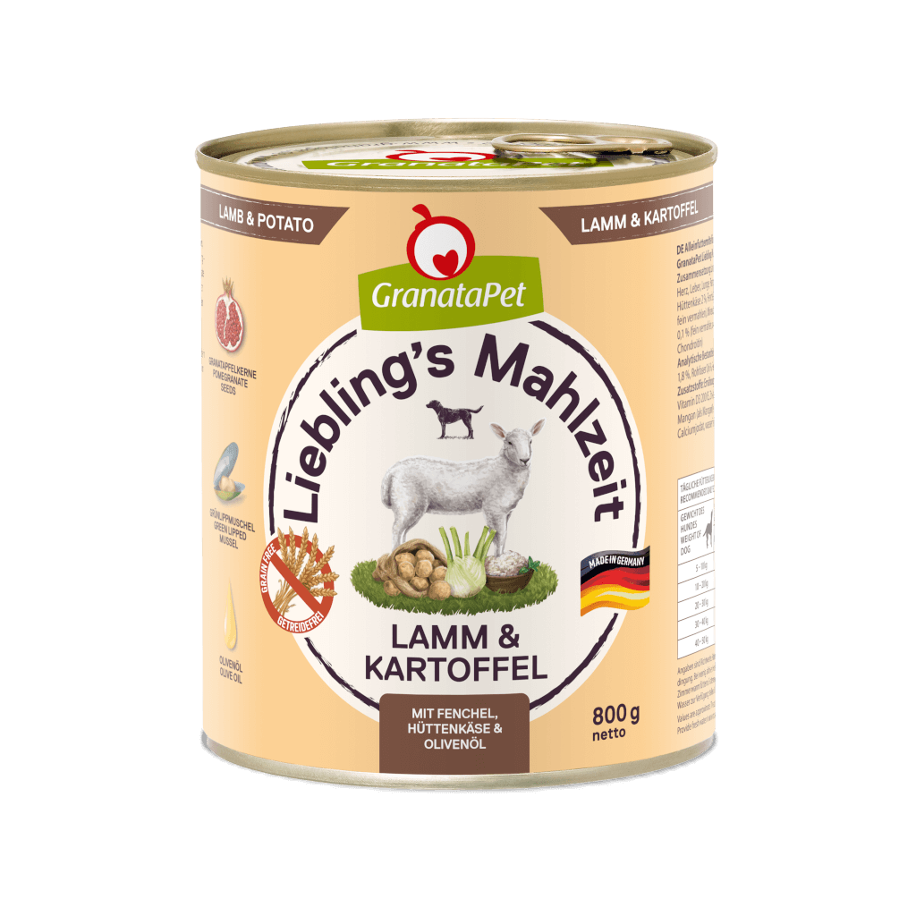 GranataPet Liebling's Mahlzeit is the ideal, balanced whole food thanks to its meaty, fine composition - gently steam-cooked just once. The targeted addition of fennel, cottage cheese and olive oil deliberately refines this dog food and manages to win over every dog's heart with only healthy and tasty ingredients.