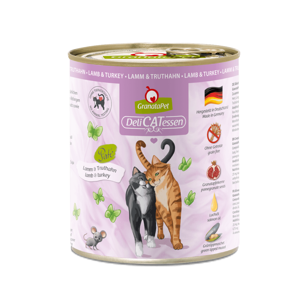 With our DeliCatessen Lamb & Turkey wet food, you can provide your velvet paw with everything a healthy cat needs in a way that is not only delicious, but also species-appropriate. The protein-rich and easily digestible complete food is gently steam-cooked during production so that all the valuable nutrients are retained. Our DeliCatessen menu is also rich in high-quality oils and supports the joints thanks to New Zealand green-lipped mussel. Of course, our eponymous pomegranate is also included here and rounds off the wet food to support the immune system.
