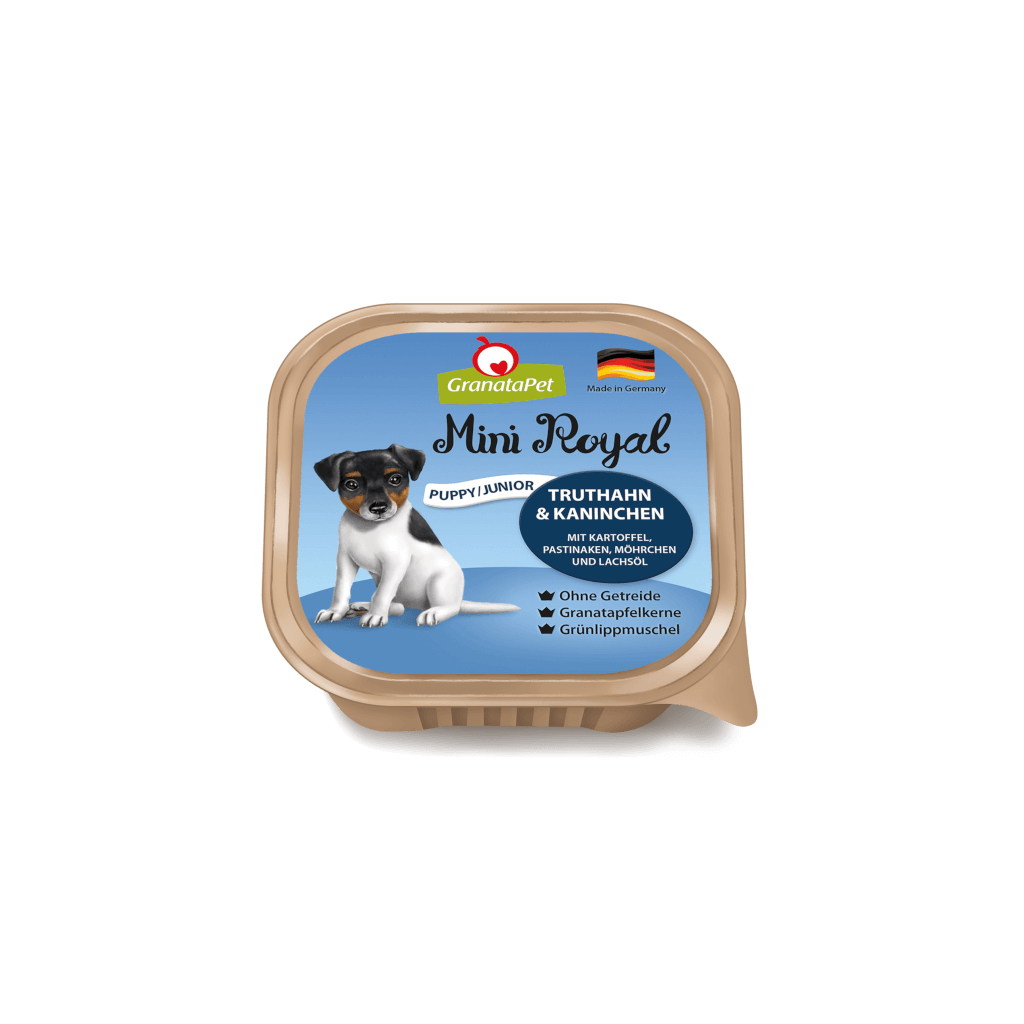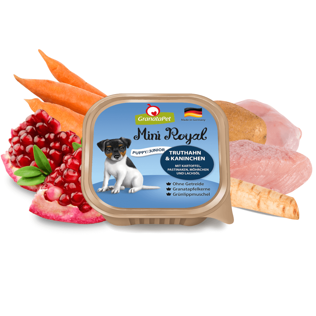 GranataPet Mini Royal Turkey & Rabbit Junior with potatoes, parsnips, carrots and salmon oil offers a tasty diet for your growing dog up to the age of 10 months. Thanks to the high proportion of high-quality meat, your pet is optimally nourished in a natural way. This provides the young and growing organism with everything it needs. The products are all developed by us without animal testing and manufactured in Germany. The gentle manufacturing process ensures that the ingredients retain their natural vitamins and nutrients.