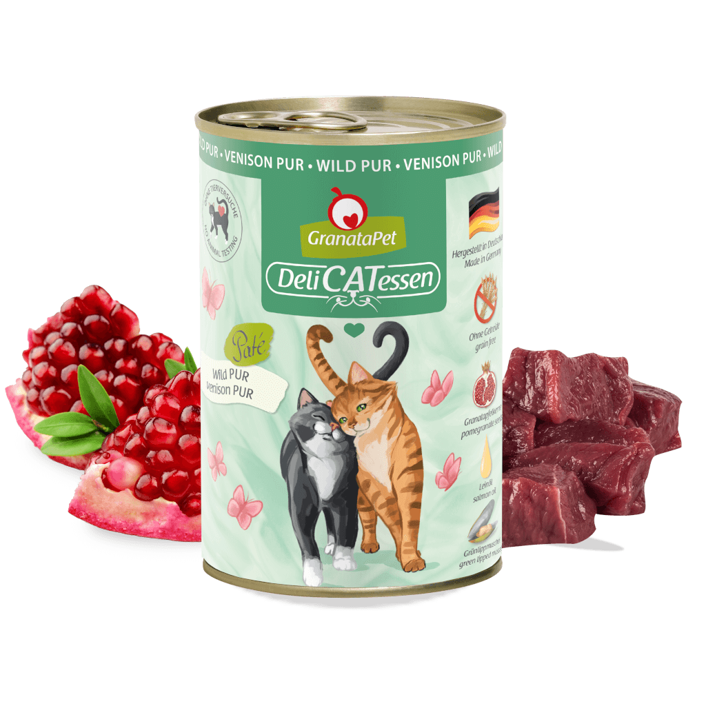 PUR: venison meat 72% (consisting of muscle meat, heart, lung, liver), venison broth 24,9%, pomegranate seeds 1%, linseed oil 1%, mineral nutrients 1%, green-lipped mussel 0,1%