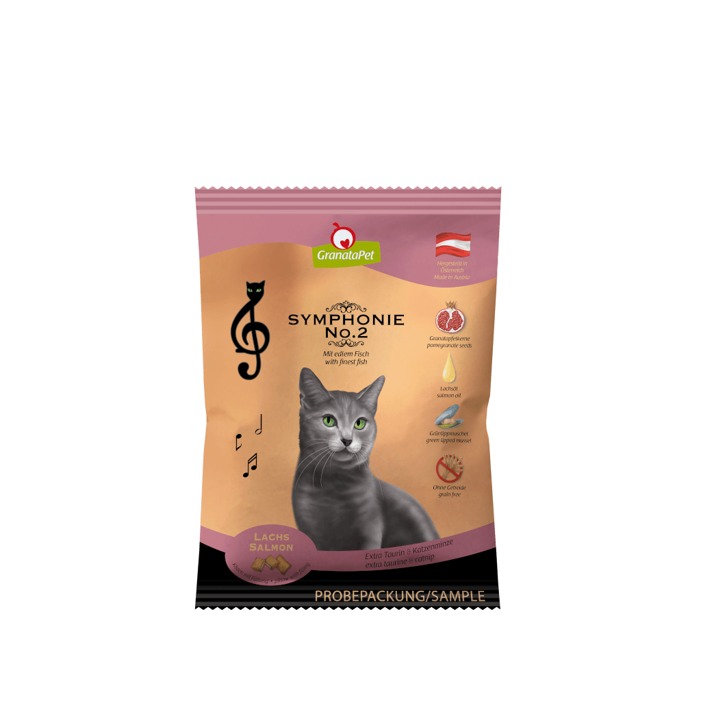 GranataPet Symphonie No. 2 Salmon dry food is a finely balanced delicacy that provides your cat with all the important nutrients it needs. Thanks to the exclusively high-quality ingredients and the gentle production process, the dry food is very well tolerated and easy to digest. The pleasant scent of catnip ensures a high level of acceptance, while salmon oil and pomegranate seeds not only make the coat shine, but also support the immune system.