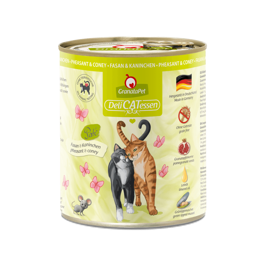 With our DeliCatessen Pheasant & Coney wet food, you can provide your velvet paw with everything a healthy cat needs in a way that is not only delicious, but also species-appropriate. The protein-rich and easily digestible complete food is gently steam-cooked during production so that all the valuable nutrients are retained. Our DeliCatessen menu is also rich in high-quality oils and supports the joints thanks to New Zealand green-lipped mussel. Of course, our eponymous pomegranate is also included here and rounds off the wet food to support the immune system.