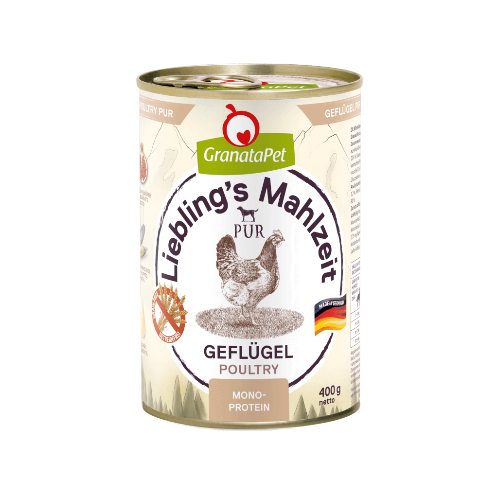 GranataPet Liebling's Mahlzeit PUR Poultry is a classic, savoury meat can (single animal protein). Fresh meaty preparation, gently steam-cooked only once.