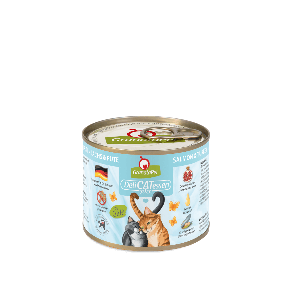 With our DeliCatessen Salmon & Turkey wet food, you can provide your velvet paw with everything a healthy cat needs in a way that is not only delicious, but also species-appropriate. The protein-rich and easily digestible complete food is gently steam-cooked during production so that all the valuable nutrients are retained. Our DeliCatessen menu is also rich in high-quality oils and supports the joints thanks to New Zealand green-lipped mussel. Of course, our eponymous pomegranate is also included here and rounds off the wet food to support the immune system.