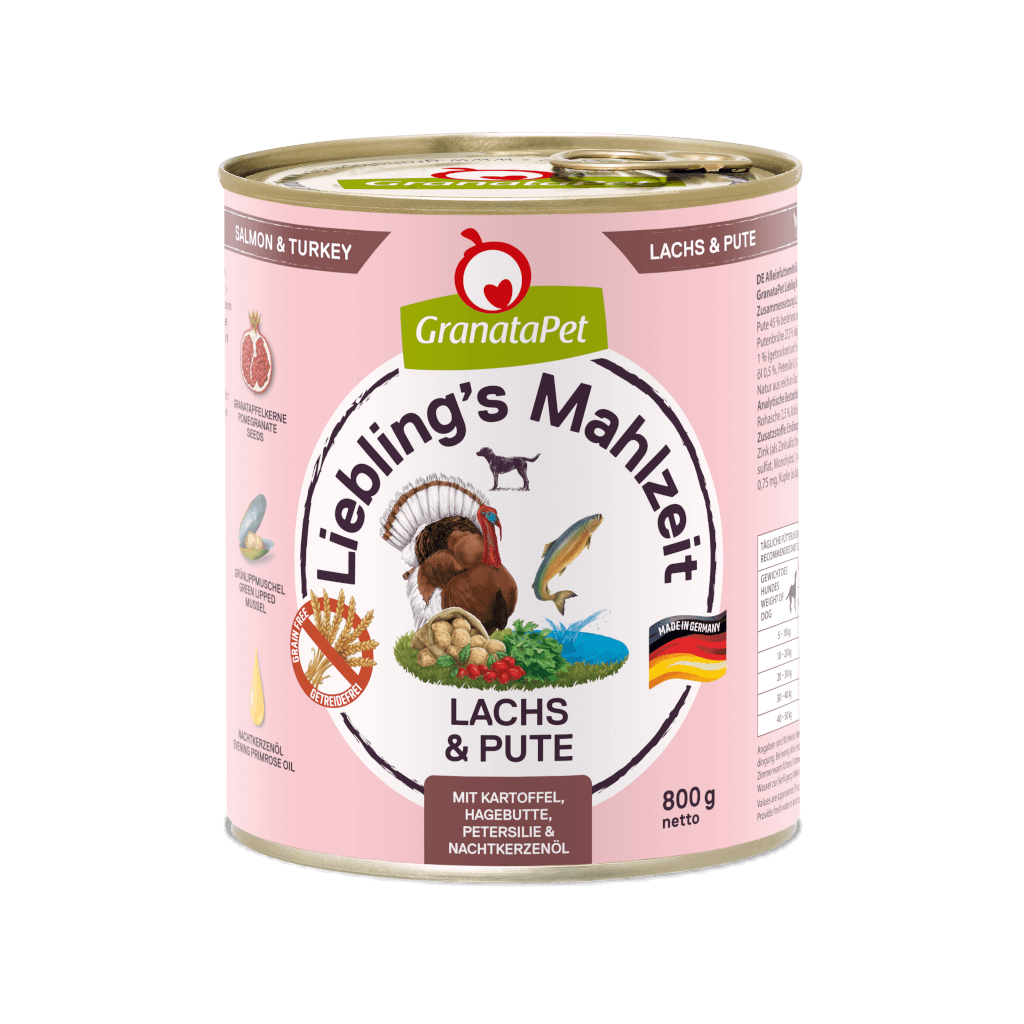 GranataPet Liebling's Mahlzeit is the ideal, balanced complete food thanks to its meaty, fine composition - gently steam-cooked just once. The targeted addition of potatoes, rosehips, parsley and evening primrose oil deliberately refines this dog food and manages to win over every dog's heart with only healthy and tasty ingredients.