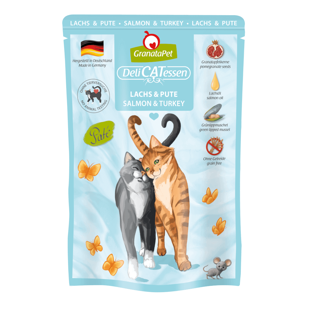 With our DeliCatessen Salmon & Turkey wet food, you can provide your velvet paw with everything a healthy cat needs in a way that is not only delicious, but also species-appropriate. The protein-rich and easily digestible complete food is gently steam-cooked during production so that all the valuable nutrients are retained. Our DeliCatessen menu is also rich in high-quality oils and supports the joints thanks to New Zealand green-lipped mussel. Of course, our eponymous pomegranate is also included here and rounds off the wet food to support the immune system.