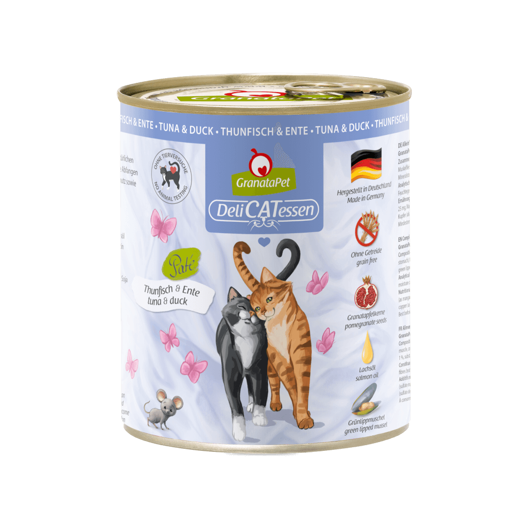 With our DeliCatessen Tuna & Duck wet food, you can provide your velvet paw with everything a healthy cat needs in a way that is not only delicious, but also species-appropriate. The protein-rich and easily digestible complete food is gently steam-cooked during production so that all the valuable nutrients are retained. Our DeliCatessen menu is also rich in high-quality oils and supports the joints thanks to New Zealand green-lipped mussel. Of course, our eponymous pomegranate is also included here and rounds off the wet food to support the immune system.