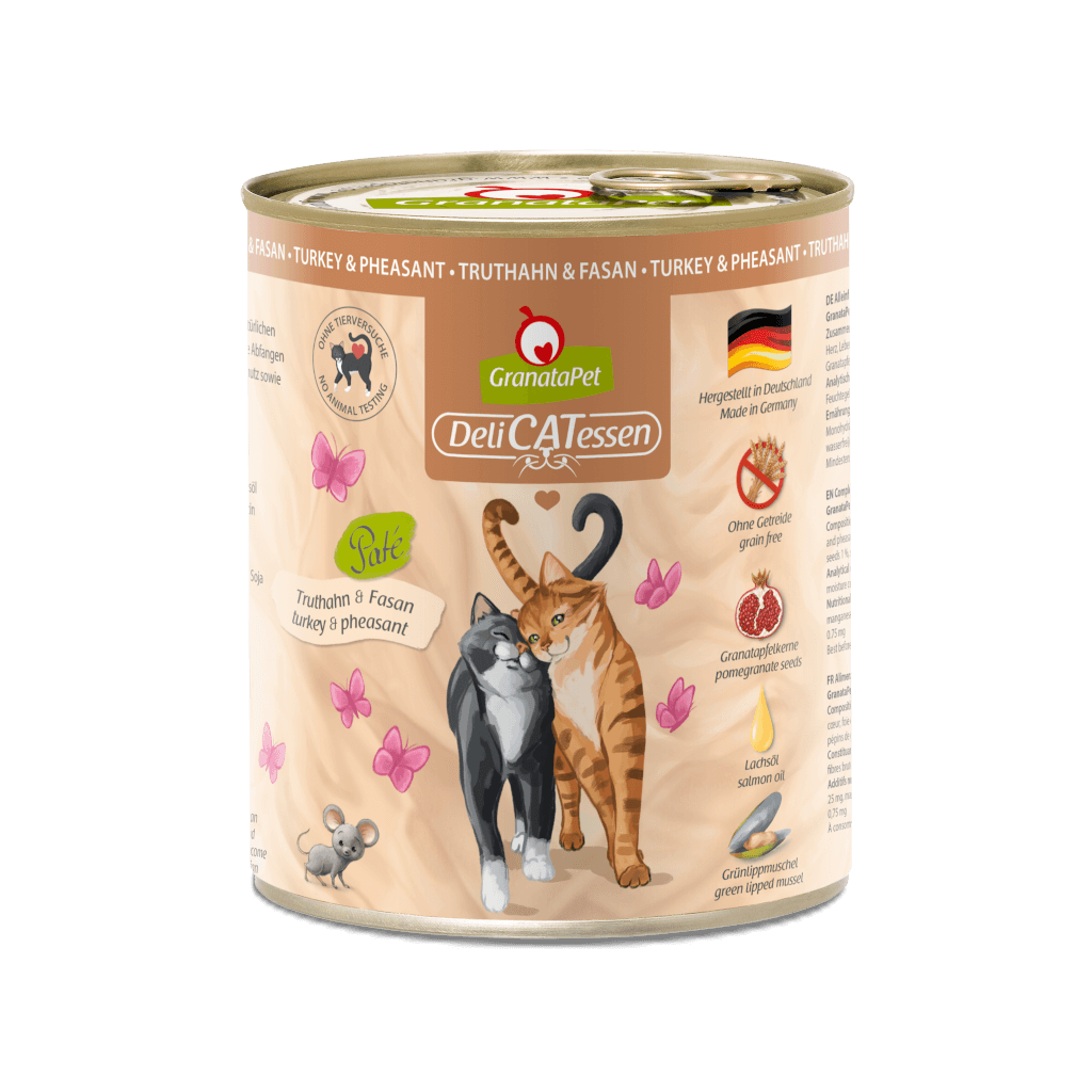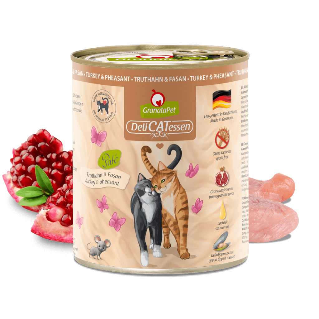 With our DeliCatessen Turkey & Pheasant wet food, you can provide your velvet paw with everything a healthy cat needs in a way that is not only delicious, but also species-appropriate. The protein-rich and easily digestible complete food is gently steam-cooked during production so that all the valuable nutrients are retained. Our DeliCatessen menu is also rich in high-quality oils and supports the joints thanks to New Zealand green-lipped mussel. Of course, our eponymous pomegranate is also included here and rounds off the wet food to support the immune system.
