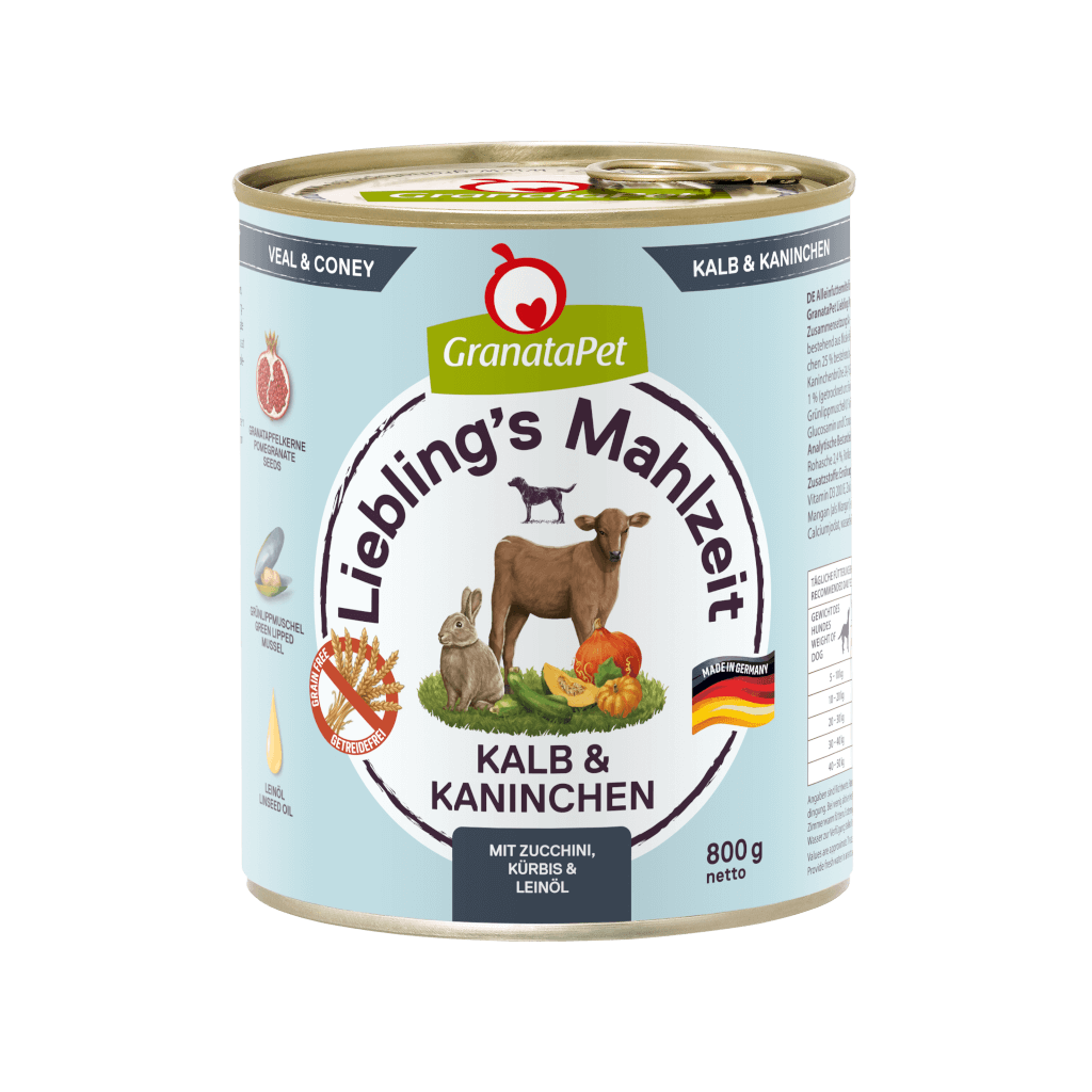 With its high meat content and finely balanced composition, GranataPet Liebling's Mahlzeit Veal & Rabbit is the ideal, balanced complete food that is gently steam-cooked only once to preserve all the important nutrients. The targeted addition of courgette, pumpkin and linseed oil deliberately refines this dog food and manages to win over every dog's heart with only healthy and tasty ingredients.