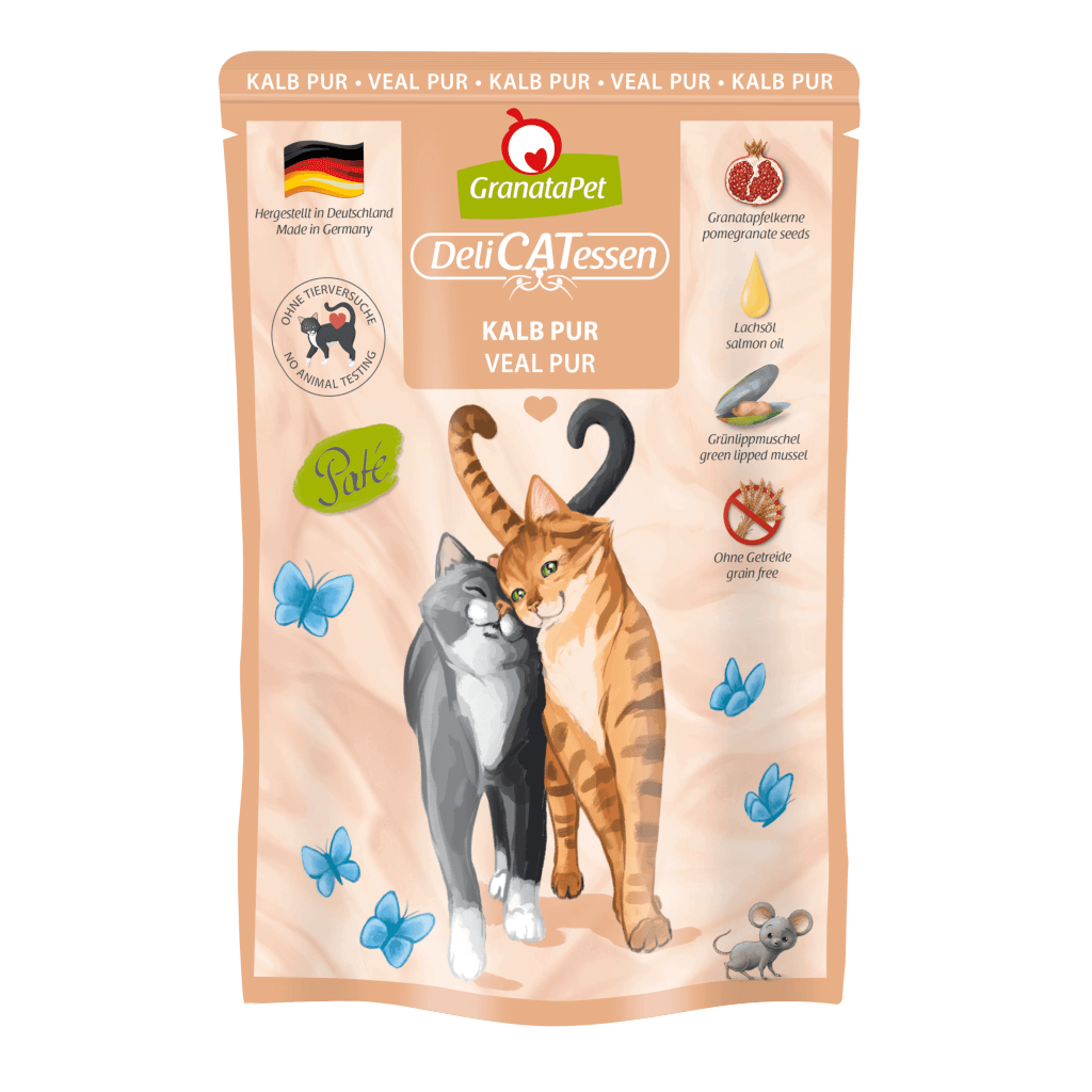 With our DeliCatessen Veal PUR wet food, you can provide your velvet paw with everything a healthy cat needs in a way that is not only delicious, but also species-appropriate. The protein-rich and easily digestible complete food is gently steam-cooked during production so that all the valuable nutrients are retained. Our DeliCatessen menu is also rich in high-quality oils and supports the joints thanks to New Zealand green-lipped mussel. Of course, our eponymous pomegranate is also included here and rounds off the wet food to support the immune system.