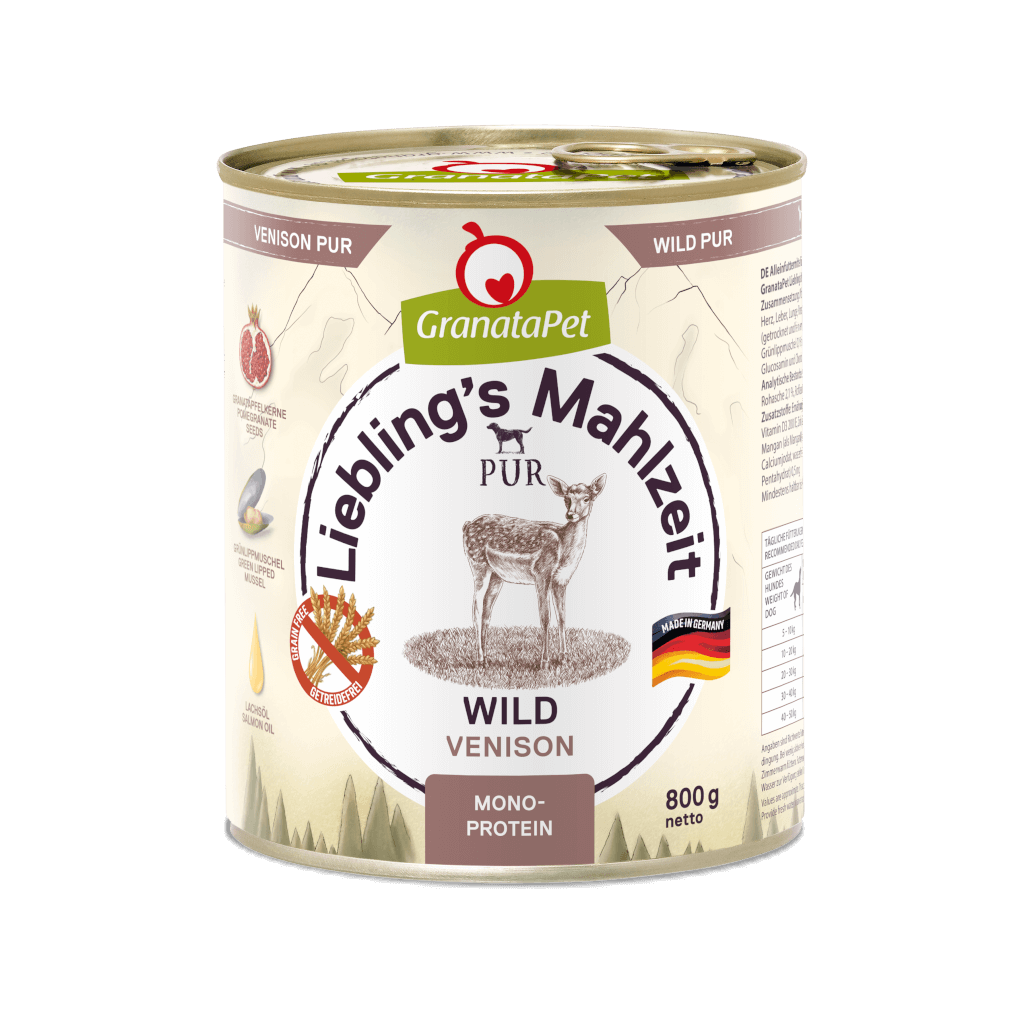 GranataPet Liebling's Mahlzeit PUR Wild is a classic, savoury meat can (single animal protein). Fresh meaty preparation, gently steam-cooked only once.
