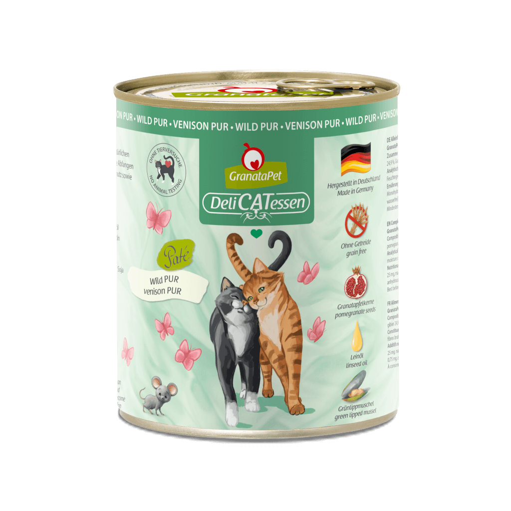 With our DeliCatessen Venison PUR wet food, you can provide your velvet paw with everything a healthy cat needs in a way that is not only delicious, but also species-appropriate. The protein-rich and easily digestible complete food is gently steam-cooked during production so that all the valuable nutrients are retained. Our DeliCatessen menu is also rich in high-quality oils and supports the joints thanks to New Zealand green-lipped mussel. Of course, our eponymous pomegranate is also included here and rounds off the wet food to support the immune system.