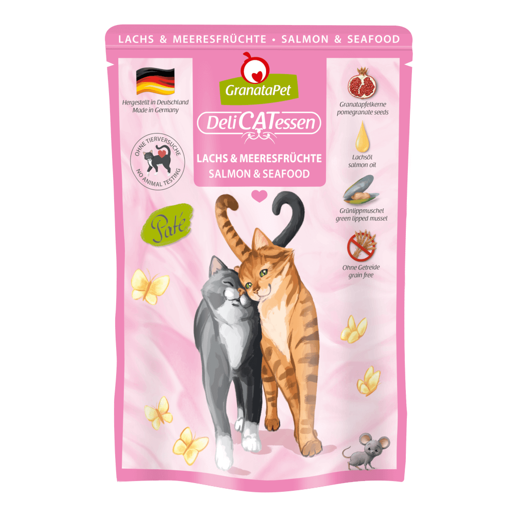 With our DeliCatessen Salmon & Seafood wet food, you can provide your velvet paw with everything a healthy cat needs in a way that is not only delicious, but also species-appropriate. The protein-rich and easily digestible complete food is gently steam-cooked during production so that all the valuable nutrients are retained. Our DeliCatessen menu is also rich in high-quality oils and supports the joints thanks to New Zealand green-lipped mussel. Of course, our eponymous pomegranate is also included here and rounds off the wet food to support the immune system.
