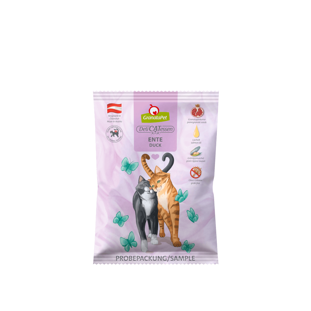 GranataPet DeliCATessen Trockenfutter Ente versorgt Deine Katze dank der erlesenen, natürlichen Zutaten mit allen Nährstoffen, die sie braucht. Die Komposition beinhaltet einen sehr hohen Fleischanteil aus Muskelfleisch sowie hochwertige Innereien. Abgerundet wird die Rezeptur durch die Neuseeländische Grünlippmuschel zum Schutz von Knochen und Gelenken, Granatapfelkerne zum Schutz des Immunsystems sowie Lachsöl als wertvoller Lieferant von Omega-3- und Omega-6- Fettsäuren. Die enthaltenen Katzenminzeblätter fördern die Akzeptanz und tragen zum Wohlbefinden der Katze bei.