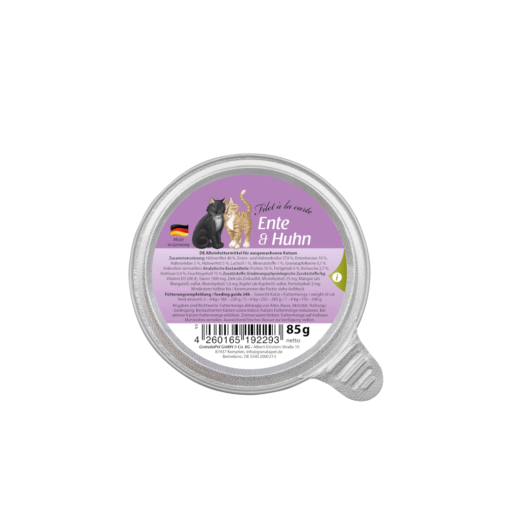 GranataPet Filet à la carte mit Ente & Huhn ist ein schmackhaftes Vollwertmenü aus zarten Filetstückchen. Verfeinert wird die Rezeptur durch hochwertiges Lachsöl und Granatapfelkerne. Schonend in der eigenen Brühe gegart ist das erstklassige naturbelassene Nassfutter besonders schmackhaft und bekömmlich. Das Lachsöl schützt die Haut Ihrer Katze und sorgt für ein seidiges, glänzendes Fell. Hinzu kommen Mineralstoffe, Taurin und weitere vitalisierende Zutaten, die das saftige Menü zu einer ausgewogenen Vollwert-Kost machen.