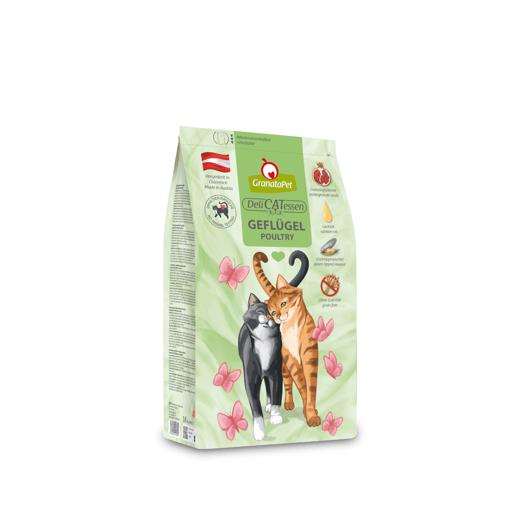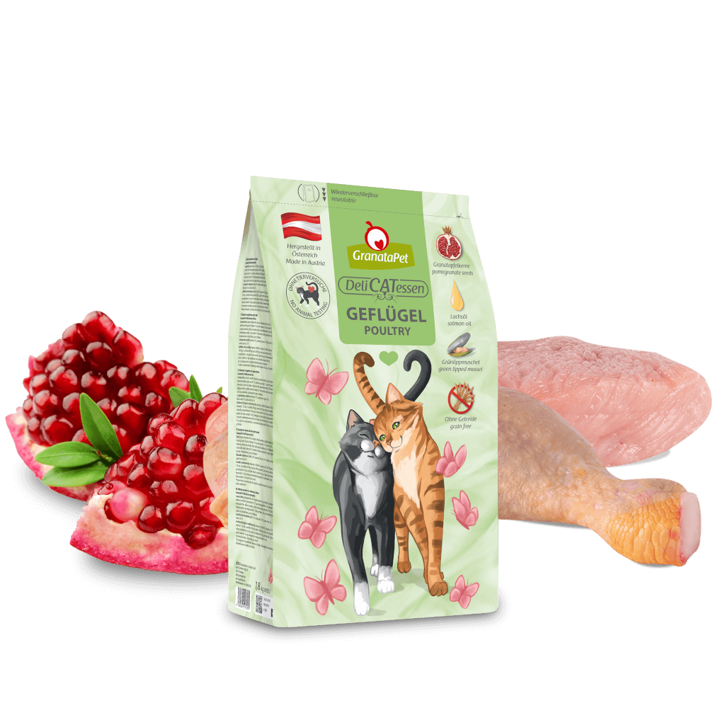 GrantaPet DeliCATessen Trockenfutter ist ein hochwertiges Alleinfuttermittel für Katzen jeder Lebensphase – ohne Getreide, mit hohem Fleischanteil, Granatapfelkernen, Lachsöl, Katzenminze und Taurin. Da Katzen von Natur aus Raubtiere und Fleischfresser sind, ist ihr Verdauungssystem auch danach ausgelegt. Getreide kann von Katzen nur schwer verdaut und kaum verwertet werden. GranataPet verzichtet daher auf Getreide in der Tiernahrung und sichert so eine optimale und an der Natur orientierte Ernährung. Das GranataPet DeliCATessen Trockenfutter wird ohne Tierversuche entwickelt und in Österreich hergestellt. Der schonende Herstellungsprozess sorgt dafür, dass wichtige Nährstoffe und Vitamine in den Zutaten erhalten bleiben. Dank der lecker duftenden Granatapfelkerne und der anregenden Katzenminze wird die DeliCATessen Mahlzeit auch von anspruchsvollen Leckermäulchen gerne verzehrt.