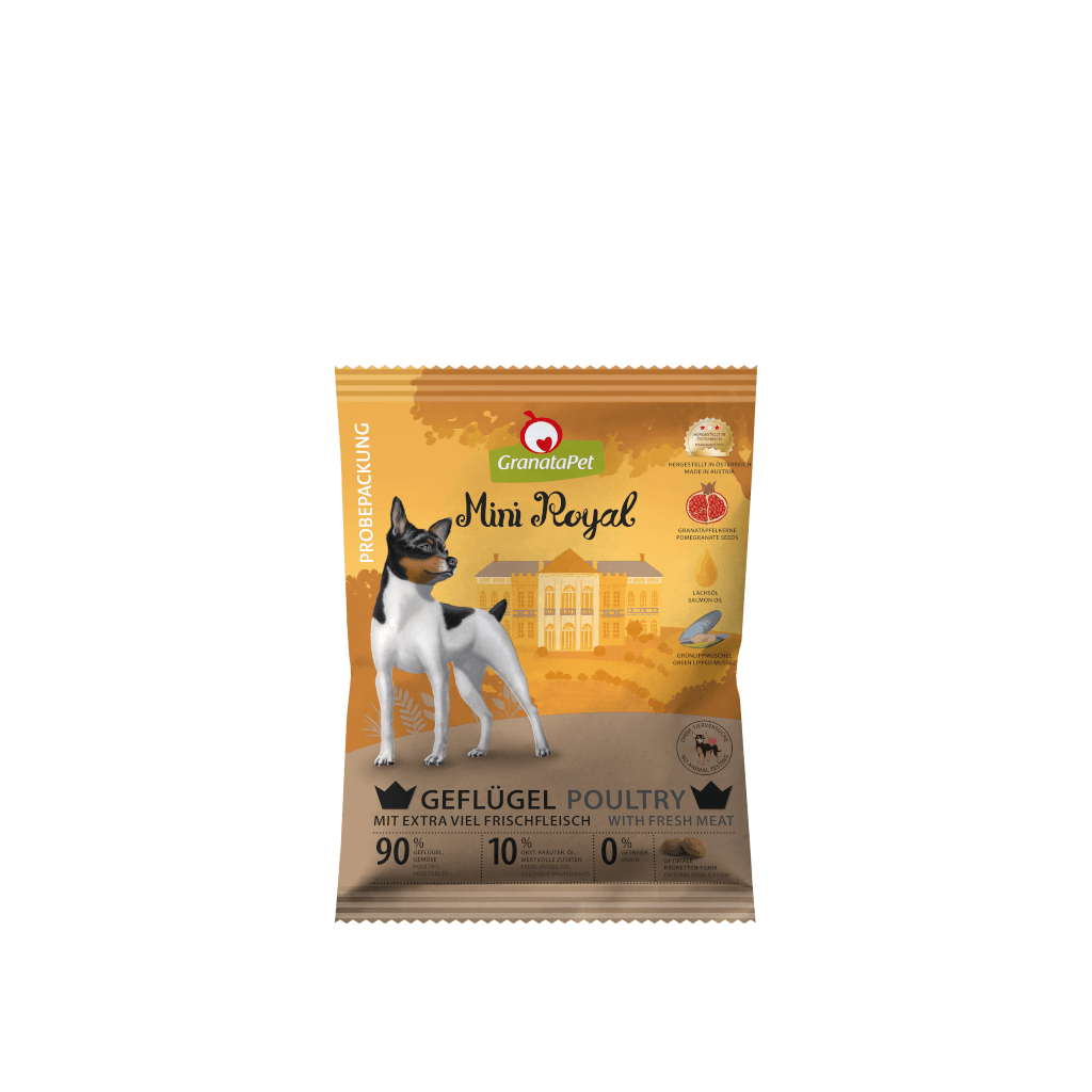Speziell für die kleineren Vertreter unserer geliebten Fellnasen haben wir das GranataPet Mini Royal Trockenfutter Geflügel entwickelt. Es bietet Deinem Liebling nicht nur eine artgerechte, schmackhafte Ernährung, sondern ist dank der extra kleinen Kroketten für jeden kleinen Vierbeiner besonders gut zu kauen. Viel frisches Fleisch sowie Mineralstoffe und Vitamine versorgen Deinen Liebling zusammen mit gesunden Allgäuer Bergwiesenkräutern mit allen notwendigen Nährstoffen und gewährleisten eine bedarfsdeckende Ernährung, die garantiert getreide- und zuckerfrei ist.