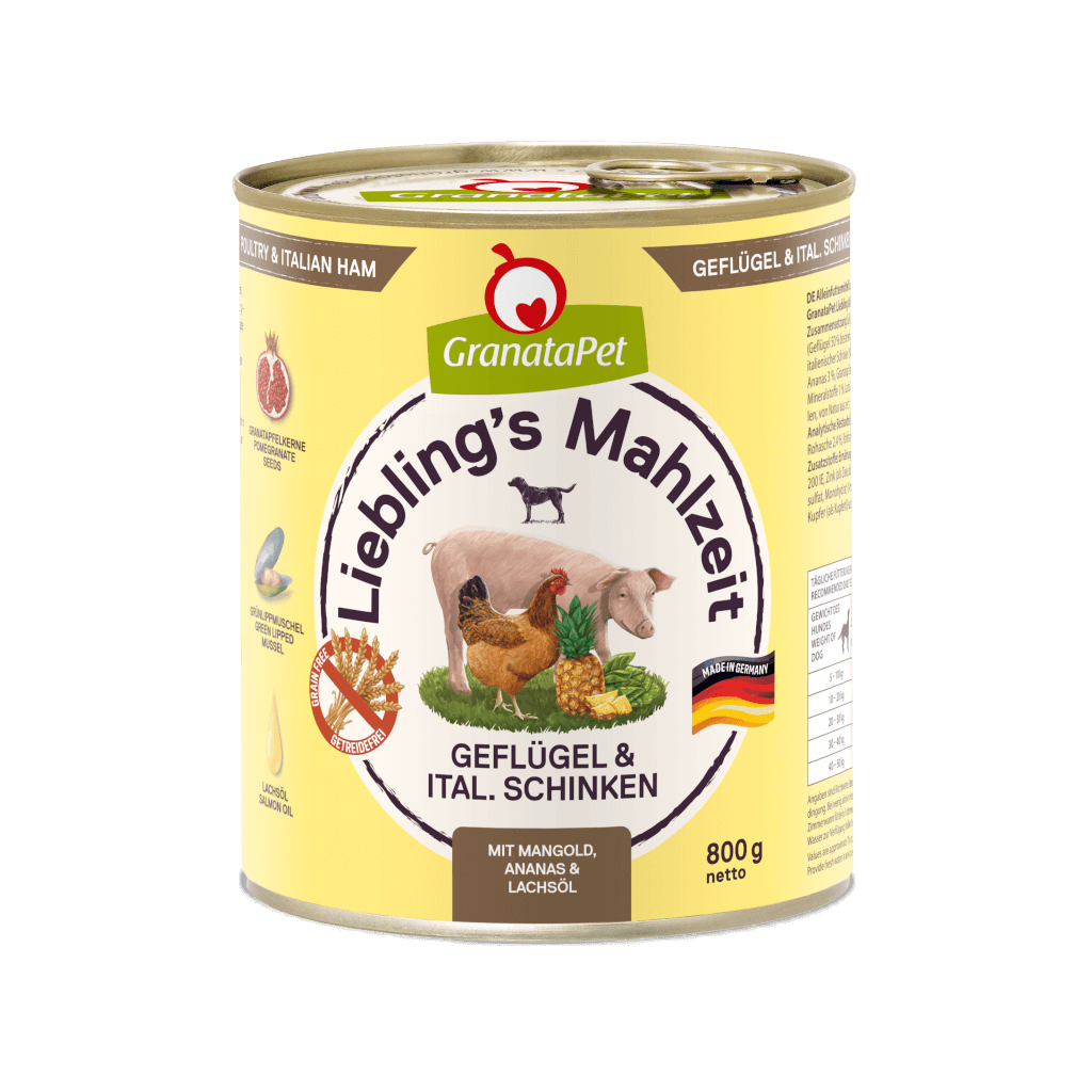 GranataPet Liebling’s Mahlzeit ist aufgrund seiner fleischigen, feinen Komposition die ideale, ausbalancierte Vollwertnahrung – nur einmalig schonend dampfgegart. Durch die gezielte Zugabe von Mangold, Ananas und Lachsöl wird dieses Hundefutter bewusst verfeinert und schafft es, ausschließlich mit gesunden und leckeren Zutaten jedes Hundeherz zu erobern.