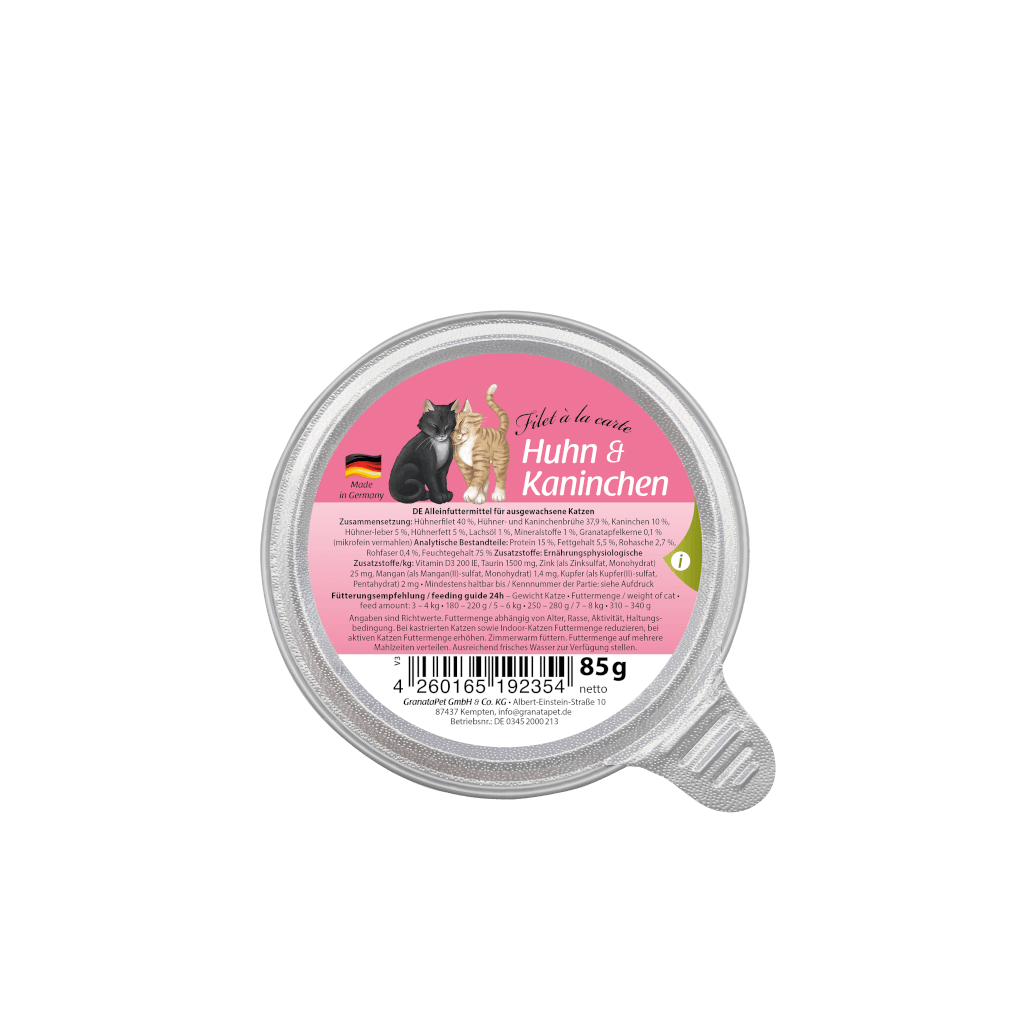 GranataPet Filet à la carte mit Huhn & Kaninchen ist ein schmackhaftes Vollwertmenü aus zarten Filetstückchen. Verfeinert wird die Rezeptur durch hochwertiges Lachsöl und Granatapfelkerne. Schonend in der eigenen Brühe gegart ist das erstklassige naturbelassene Nassfutter besonders schmackhaft und bekömmlich. Das Lachsöl schützt die Haut Ihrer Katze und sorgt für ein seidiges, glänzendes Fell. Hinzu kommen Mineralstoffe, Taurin und weitere vitalisierende Zutaten, die das saftige Menü zu einer ausgewogenen Vollwert-Kost machen.
