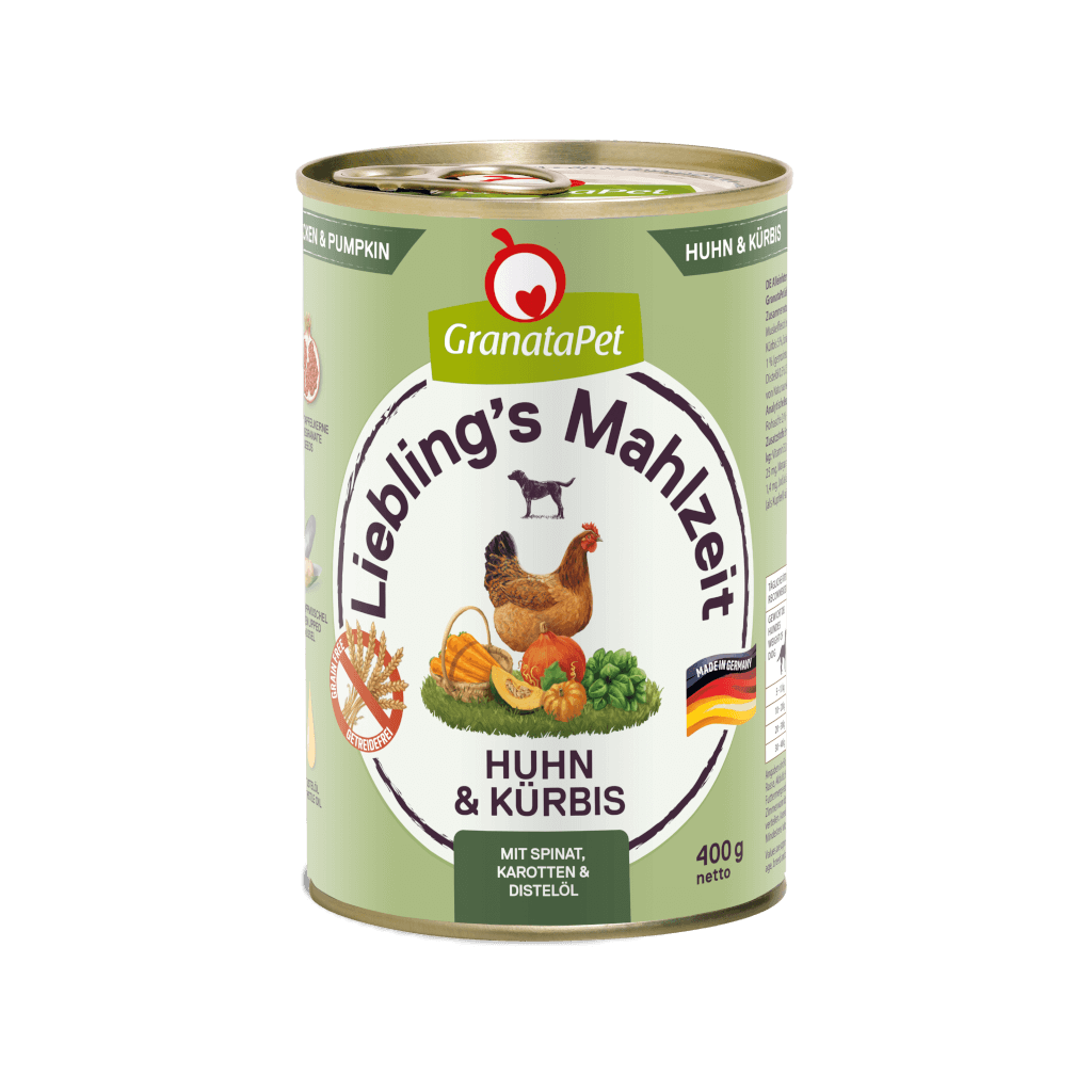 GranataPet Liebling’s Mahlzeit ist aufgrund seiner fleischigen, feinen Komposition die ideale, ausbalancierte Vollwertnahrung – nur einmalig schonend dampfgegart. Durch die gezielte Zugabe von Spinat, Karotten und Distelöl wird dieses Hundefutter bewusst verfeinert und schafft es, ausschließlich mit gesunden und leckeren Zutaten jedes Hundeherz zu erobern.