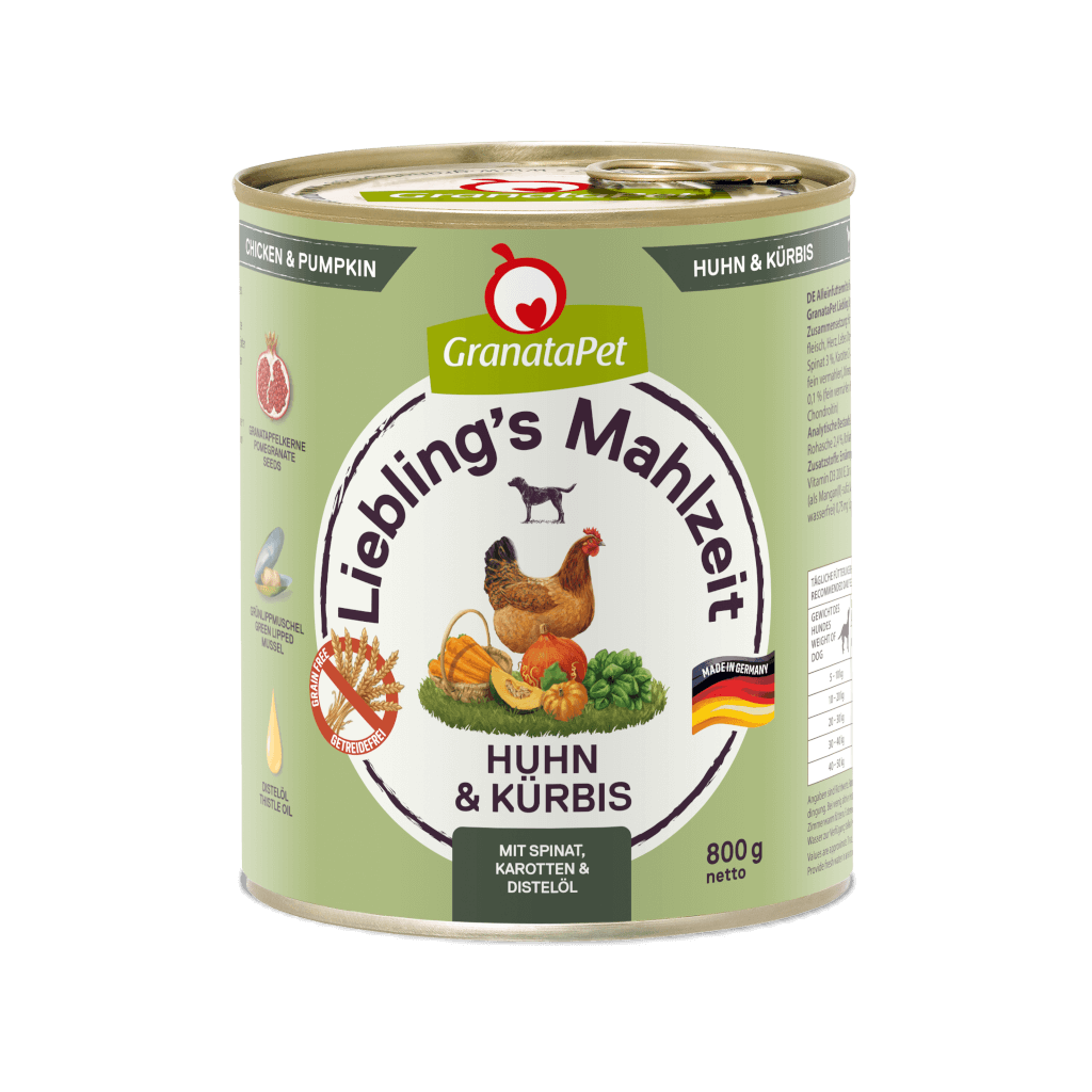 GranataPet Liebling’s Mahlzeit ist aufgrund seiner fleischigen, feinen Komposition die ideale, aus­balancierte Vollwertnahrung – nur einmalig schonend dampfgegart. Durch die gezielte Zugabe von Spinat, Karotten und Distelöl wird dieses Hundefutter bewusst verfeinert und schafft es, ausschließlich mit gesunden und leckeren Zutaten jedes Hundeherz zu erobern.