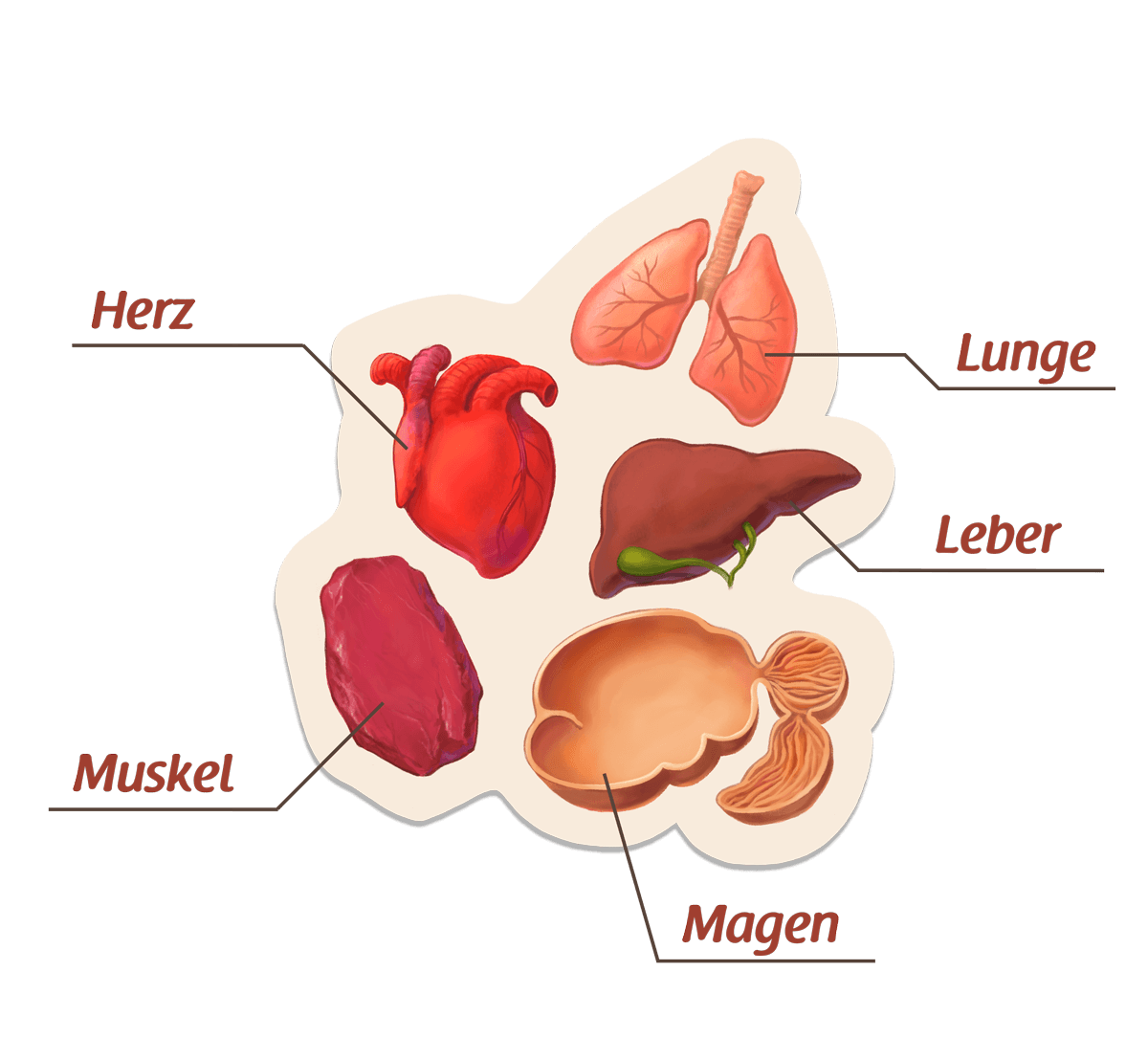 Die Muskulatur ist besonders eiweißreich und weist ein wertvolles Aminosäurenmuster auf. Zudem gilt Muskelfleisch als besonders gut verdaulich. Rind, Lamm und Schwein enthalten von Natur aus zudem relativ viel Laurin.