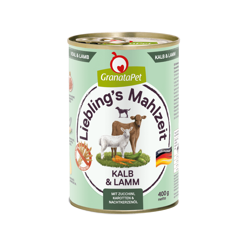 Kalb- und Lammfleisch 65% (Kalb 35% bestehend aus Muskelfleisch, Herz, Lunge, Pansen und Lamm 30% bestehend aus Muskelfleisch, Herz, Leber, Lunge, Pansen), Kalb- und Lammbrühe 23,4%, Zucchini 3%, Karotte 3%, Kartoffel 3%, Granatapfelkerne 1% (getrocknet und fein vermahlen), Mineralstoffe 1%, Nachtkerzenöl 0,5%, Grünlippmuschel 0,1% (fein vermahlen, von Natur aus reich an Glucosamin und Chondroitin)