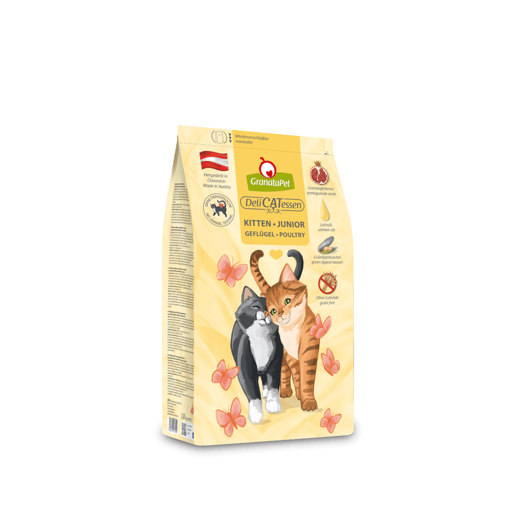GrantaPet DeliCATessen Trockenfutter ist ein hochwertiges Alleinfuttermittel für Katzen jeder Lebensphase – ohne Getreide, mit hohem Fleischanteil, Granatapfelkernen, Lachsöl, Katzenminze und Taurin. Da Katzen von Natur aus Raubtiere und Fleischfresser sind, ist ihr Verdauungssystem auch danach ausgelegt. Getreide kann von Katzen nur schwer verdaut und kaum verwertet werden. GranataPet verzichtet daher auf Getreide in der Tiernahrung und sichert so eine optimale und an der Natur orientierte Ernährung. Das GranataPet DeliCATessen Trockenfutter wird ohne Tierversuche entwickelt und in Österreich hergestellt. Der schonende Herstellungsprozess sorgt dafür, dass wichtige Nährstoffe und Vitamine in den Zutaten erhalten bleiben. Dank der lecker duftenden Granatapfelkerne und der anregenden Katzenminze wird die DeliCATessen Mahlzeit auch von anspruchsvollen Leckermäulchen gerne verzehrt.