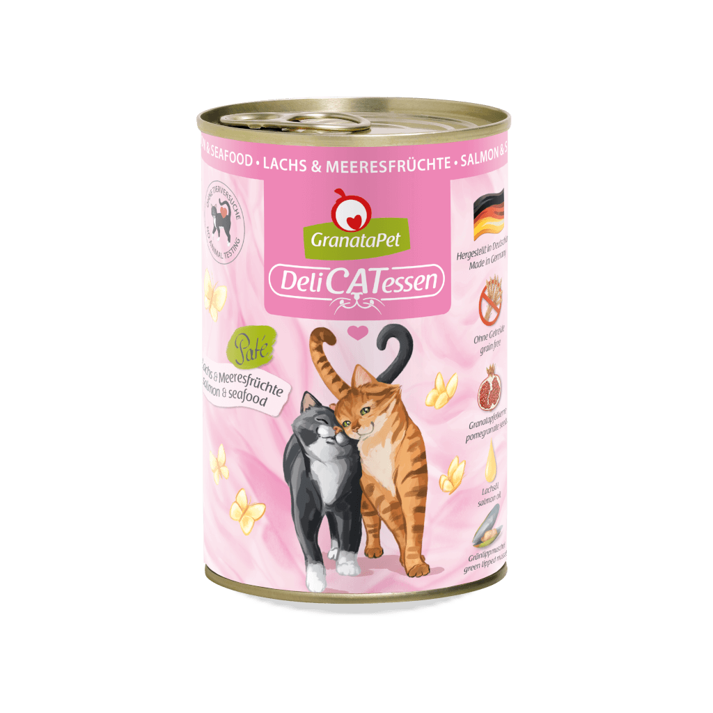 Mit unserem Nassfutter DeliCatessen Lachs & Meeresfrüchte versorgst Du deine Samtpfote nicht nur lecker, sondern auch artgerecht mit allem, was eine gesunde Katze braucht. Das proteinreiche und gut verdauliche Alleinfutter wird bei Produktion schonend dampfgegart, sodass alle wertvollen Nährstoffe erhalten bleiben. Dazu ist unser DeliCatessen Menü reich an hochwertigen Ölen und unterstützt dank neuseeländischer Grünlippmuschel die Gelenke. Unser namensgebender Granatapfel darf natürlich auch hier nicht fehlen und rundet die bedarfsdeckende Nassnahrung als Unterstützung des Immunsystems ab.
