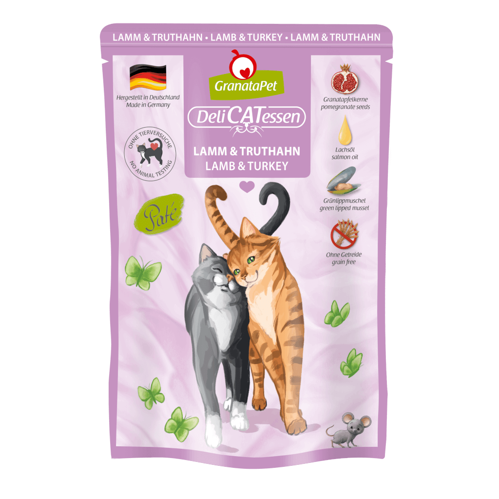 Mit unserem Nassfutter DeliCatessen Lamm & Truthahn versorgst Du deine Samtpfote nicht nur lecker, sondern auch artgerecht mit allem, was eine gesunde Katze braucht. Das proteinreiche und gut verdauliche Alleinfutter wird bei Produktion schonend dampfgegart, sodass alle wertvollen Nährstoffe erhalten bleiben. Dazu ist unser DeliCatessen Menü reich an hochwertigen Ölen und unterstützt dank neuseeländischer Grünlippmuschel die Gelenke. Unser namensgebender Granatapfel darf natürlich auch hier nicht fehlen und rundet die bedarfsdeckende Nassnahrung als Unterstützung des Immunsystems ab.