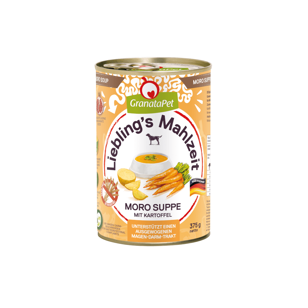 GranataPet Liebling´s Mahlzeit Moro-Suppe mit Kartoffeln vereint die heilkundlichen Ansätze der Moroschen Karottensuppe mit den darmfreundlichen Ballaststoffen der Kartoffeln. Hierbei werden frische Möhren und Kartoffeln lange schonend gekocht. Die hieraus entstandenen Oligosaccharide der Möhren, sorgen für einen natürlichen Aufbau gesunder Darmbakterien. Die enthaltene Stärke der Kartoffeln kann den Kot Ihres Hundes verfestigen, was besonders bei akutem Durchfall zu einer schnelleren Linderung führen kann. Sie sind leicht verdaulich, eine hervorragende Energiequelle und können die Darmflora unterstützen. Zusätzlich können sie den geschwächten Körper des Hundes unterstützen, ohne zusätzlich zu belasten.