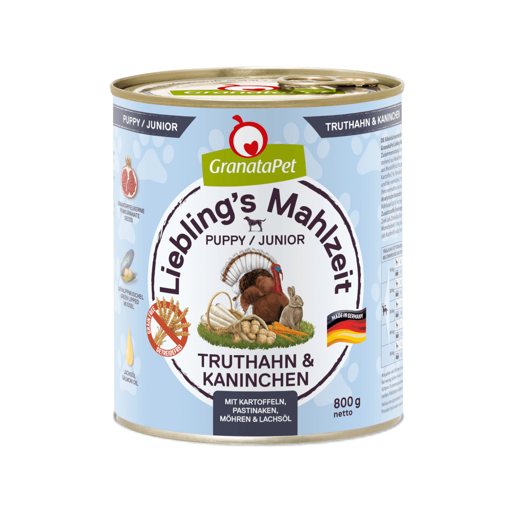 GranataPet Liebling´s Mahlzeit Puppy / Junior bietet eine schmackhafte Kost für Ihren heranwachsenden Hund – nur einmalig schonend dampfgegart. Durch die gezielte Zugabe von Kartoffeln, Pastinaken, Möhren und Lachsöl wird dieses Hundefutter bewusst verfeinert und schafft es, ausschließlich mit gesunden und leckeren Zutaten den jungen und heranwachsenden Organismus mit allem zu versorgen, was er benötigt.
