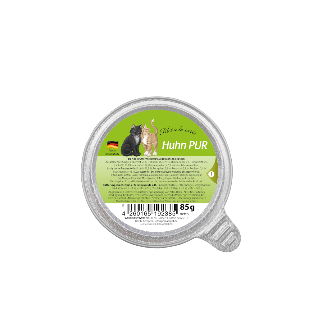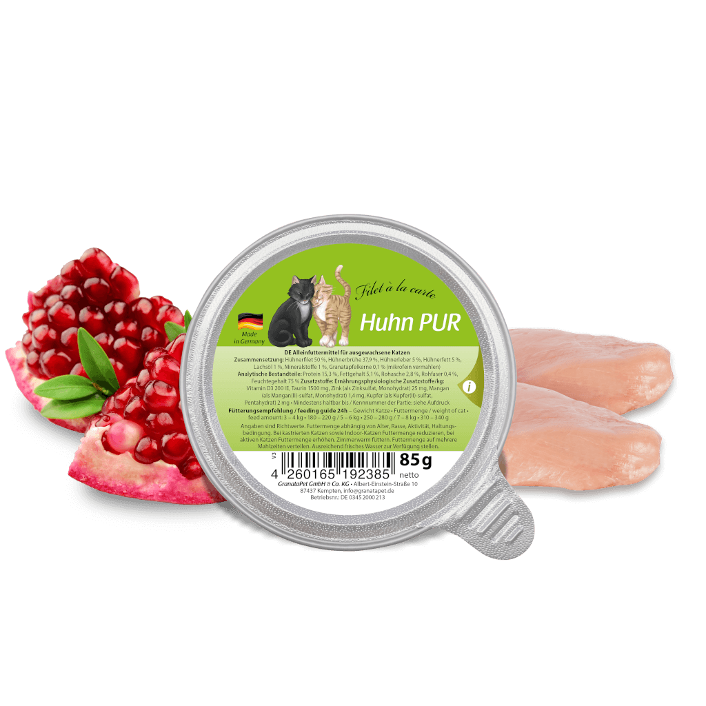 GranataPet Filet à la carte mit Huhn PUR ist ein schmackhaftes Vollwertmenü aus zarten Filetstückchen. Verfeinert wird die Rezeptur durch hochwertiges Lachsöl und Granatapfelkerne. Schonend in der eigenen Brühe gegart ist das erstklassige naturbelassene Nassfutter besonders schmackhaft und bekömmlich. Das Lachsöl schützt die Haut Ihrer Katze und sorgt für ein seidiges, glänzendes Fell. Hinzu kommen Mineralstoffe, Taurin und weitere vitalisierende Zutaten, die das saftige Menü zu einer ausgewogenen Vollwert-Kost machen.