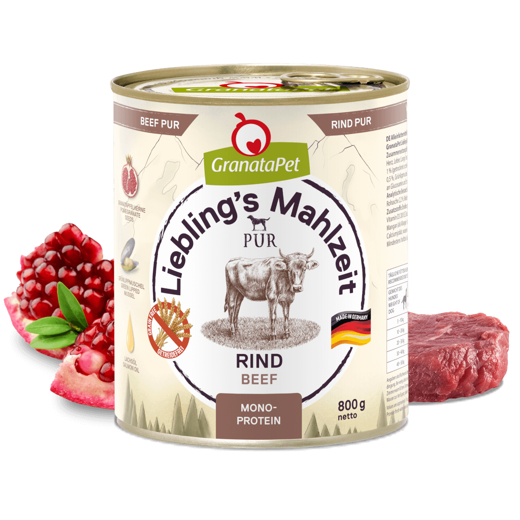 GranataPet Liebling´s Mahlzeit PUR Rind ist eine klassische, herzhafte Fleischdose (single animal protein). Frische fleischige Zubereitung, nur einmalig schonend dampfgegart.