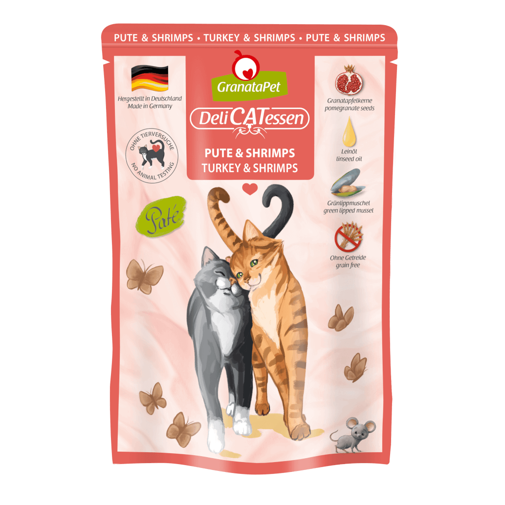 Mit unserem Nassfutter DeliCatessen Pute & Shrimps versorgst Du deine Samtpfote nicht nur lecker, sondern auch artgerecht mit allem, was eine gesunde Katze braucht. Das proteinreiche und gut verdauliche Alleinfutter wird bei Produktion schonend dampfgegart, sodass alle wertvollen Nährstoffe erhalten bleiben. Dazu ist unser DeliCatessen Menü reich an hochwertigen Ölen und unterstützt dank neuseeländischer Grünlippmuschel die Gelenke. Unser namensgebender Granatapfel darf natürlich auch hier nicht fehlen und rundet die bedarfsdeckende Nassnahrung als Unterstützung des Immunsystems ab.