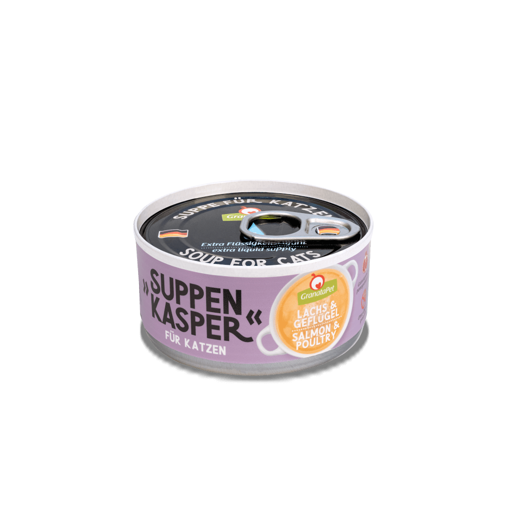 Suppenkasper – so heißt die leckere Suppe für Deine Katze. Sie unterstützt dabei, den täglichen Flüssigkeitsbedarf von Katzen optimal zu decken. Ob als Snack, als Topping für die Mahlzeit oder für den kleinen Hunger zwischendurch, die feine Brühe mit saftigen Fleischstückchen überzeugt jede Katze. Verfeinert wird die Rezeptur durch die unverzichtbaren Granatapfelkerne. Dank der hohen Konzentration an natürlichen Antioxidantien schützt die rote Götterfrucht das Immunsystem und kann den Alterungsprozess verlangsamen. Natürlich gilt auch beim Suppenkasper wie bei allen GranataPet Produkten: ohne Getreide, ohne Zuckerzusatz, ohne künstliche Farb- und Aromastoffe und ohne künstliche Konservierungsmittel. Die ideale Portionsverpackung sorgt dafür, dass die Suppe stets frisch serviert werden kann und die Katze mit ausreichend Flüssigkeit versorgt.
