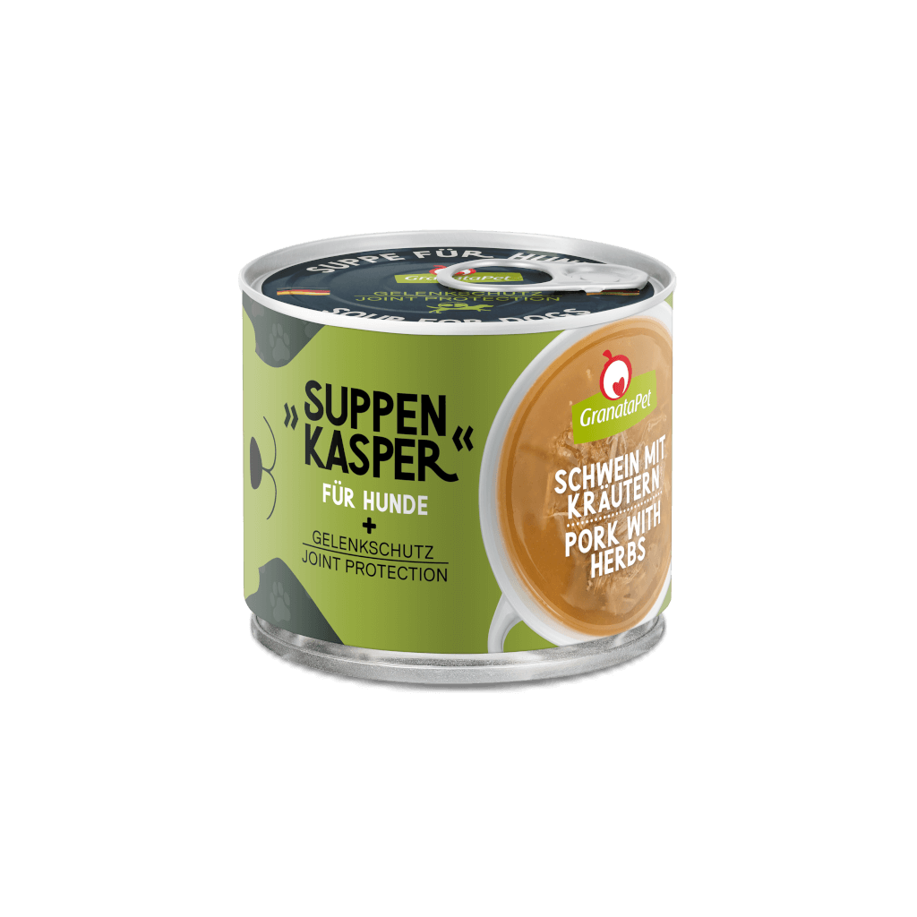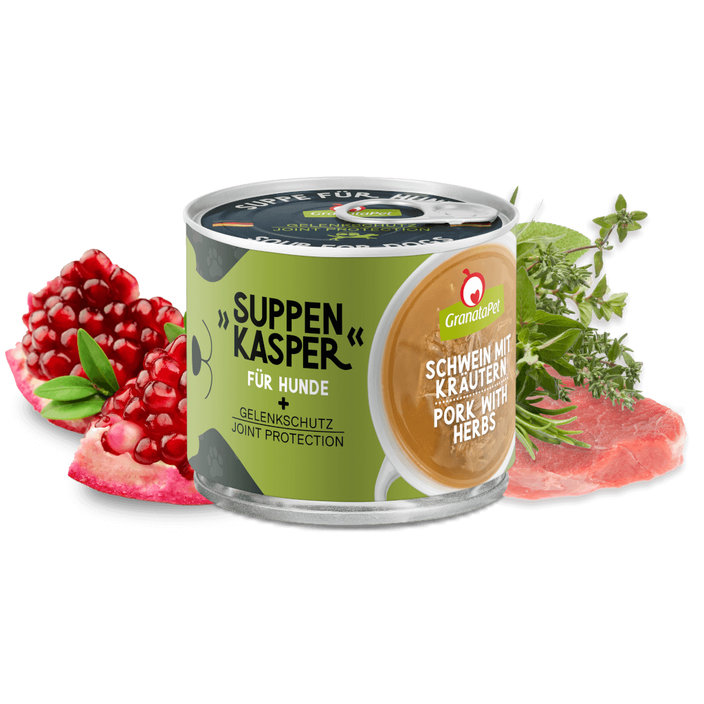 Hier kommt ein Snack der etwas anderen Art. Mit GranataPet's Suppenkasper Schwein mit Kräutern gönnst du Deinem Vierbeiner ein zum Schwanzwedeln leckeres Geschmackserlebnis. Diese feine Schlabberei ist nicht nur eine erfrischende Abwechslung, sondern unterstützt durch unsere namensgebenden Granatapfelkerne auch das Immunsystem deines Lieblings. Bei der Fütterung sind der Kreativität hier keine Grenzen gesetzt; ob als Suppe zwischendurch, als Topping oder als besonders feine Sommererfrischung in Form von Schleckeis, hier schlägt jedes Hundeherz höher.