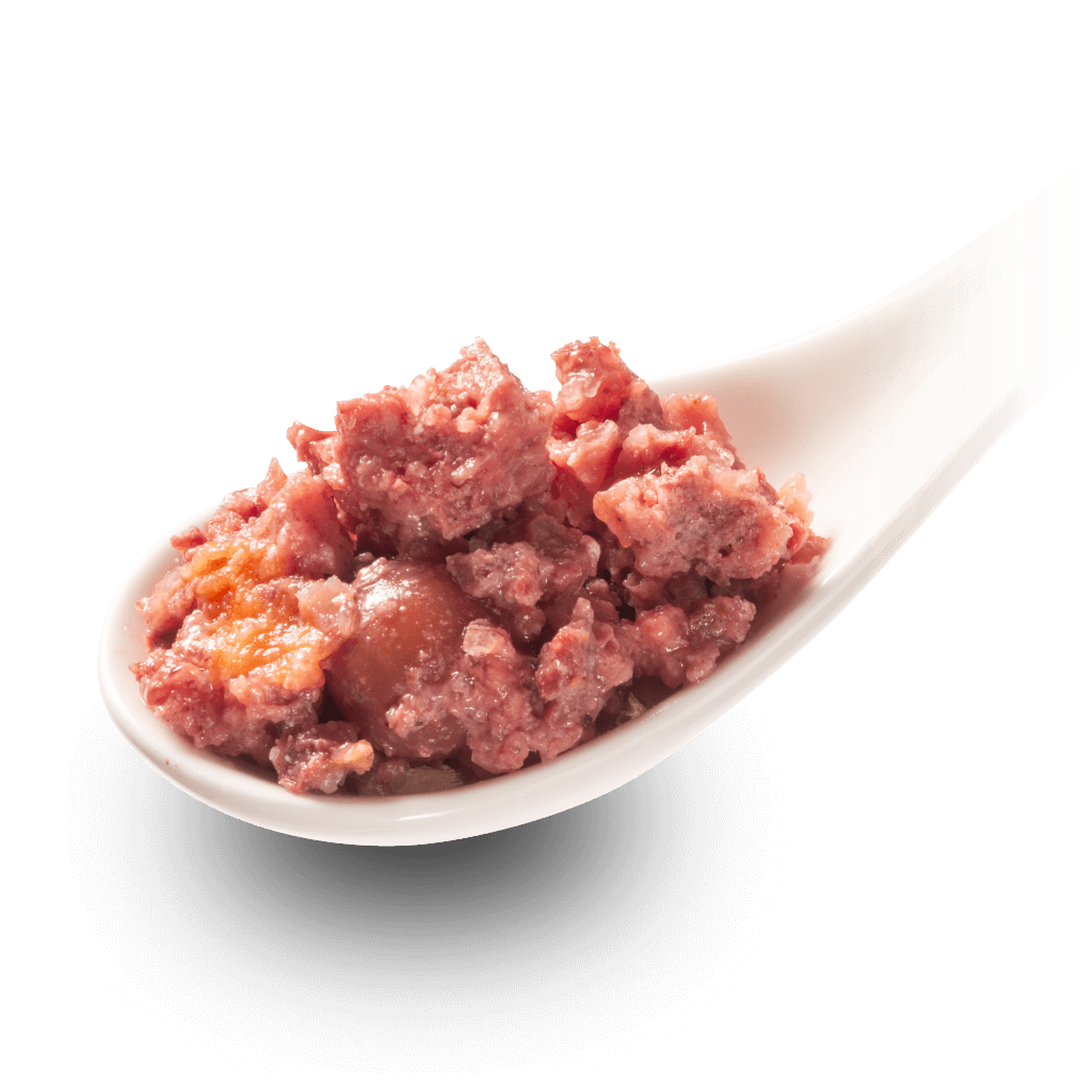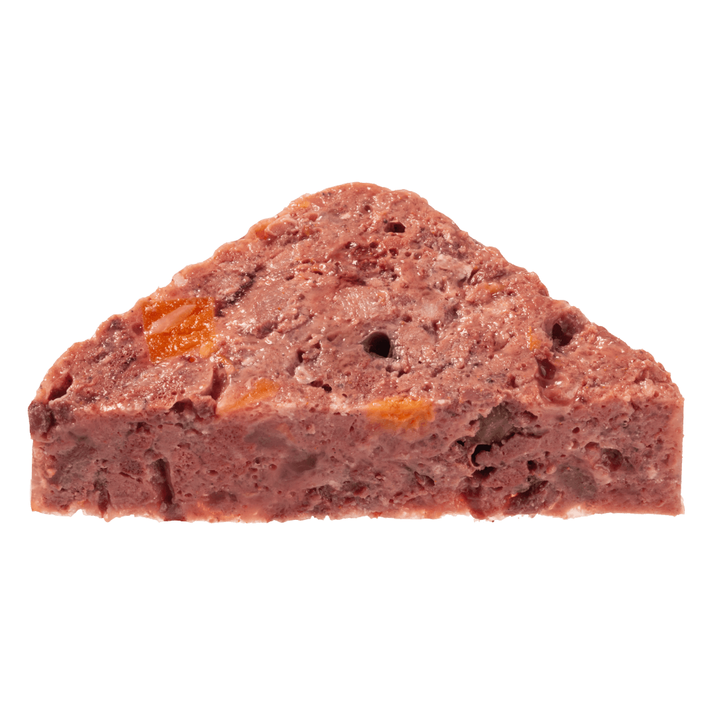 Wild- und Angus-Rindfleisch 65% (Wild 50% bestehend aus Muskelfleisch, Herz, Leber, Lunge und Angus Rind 15% bestehend aus Muskelfleisch, Herz, Leber, Lunge), Wild- und Angus-Rinderbrühe 24,4%, Süßkartoffel 5%, Cranberry 3%, Granatapfelkerne 1% (getrocknet und fein vermahlen), Mineralstoffe 1%, Sonnenblumenöl 0,5%, Grünlippmuschel 0,1% (fein vermahlen, von Natur aus reich an Glucosamin und Chondroitin)
