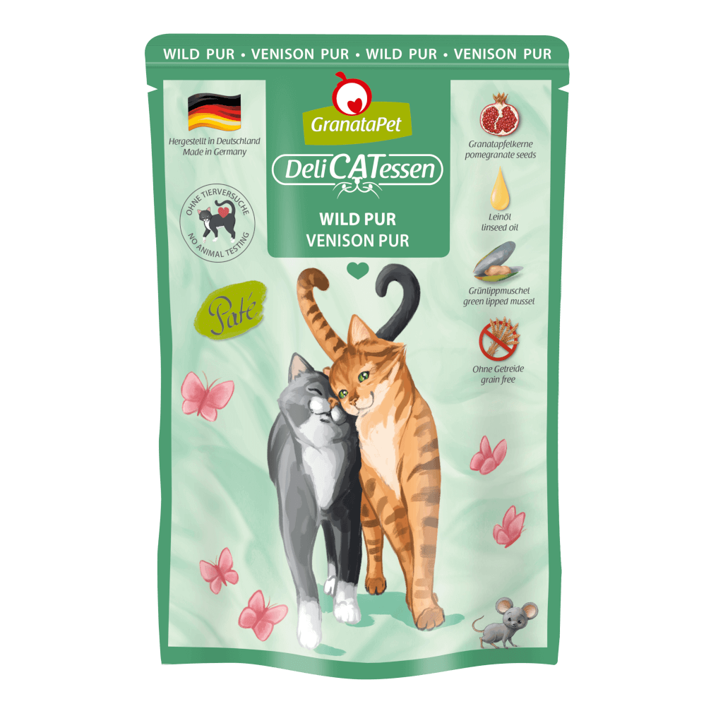 Mit unserem Nassfutter DeliCatessen Wild PUR versorgst Du deine Samtpfote nicht nur lecker, sondern auch artgerecht mit allem, was eine gesunde Katze braucht. Das proteinreiche und gut verdauliche Alleinfutter wird bei Produktion schonend dampfgegart, sodass alle wertvollen Nährstoffe erhalten bleiben. Dazu ist unser DeliCatessen Menü reich an hochwertigen Ölen und unterstützt dank neuseeländischer Grünlippmuschel die Gelenke. Unser namensgebender Granatapfel darf natürlich auch hier nicht fehlen und rundet die bedarfsdeckende Nassnahrung als Unterstützung des Immunsystems ab.